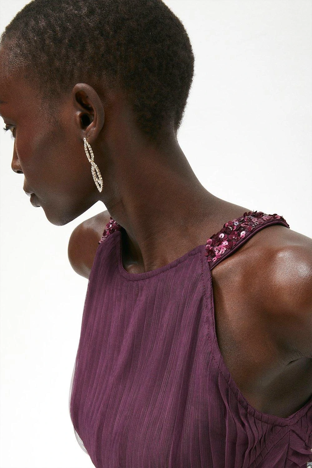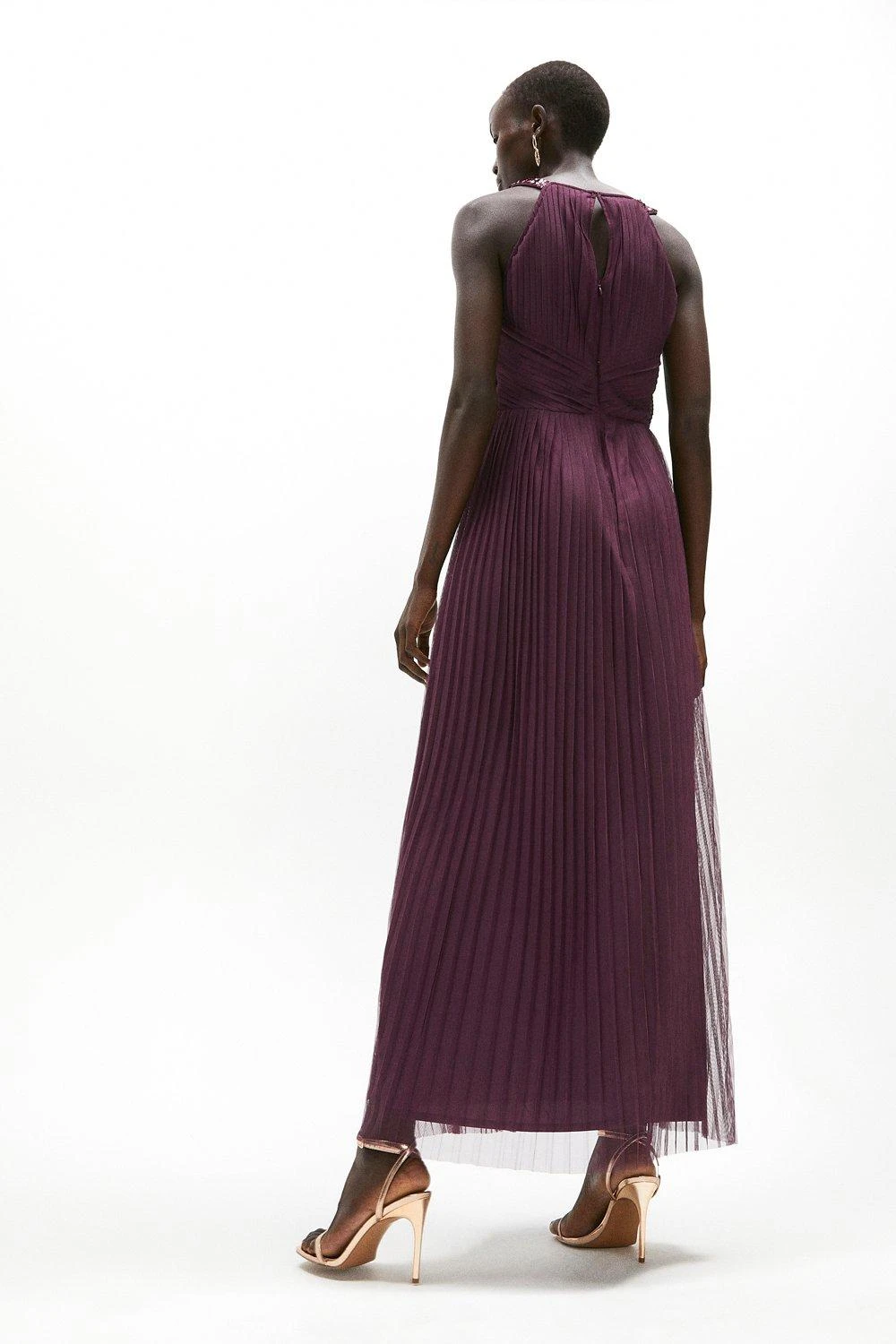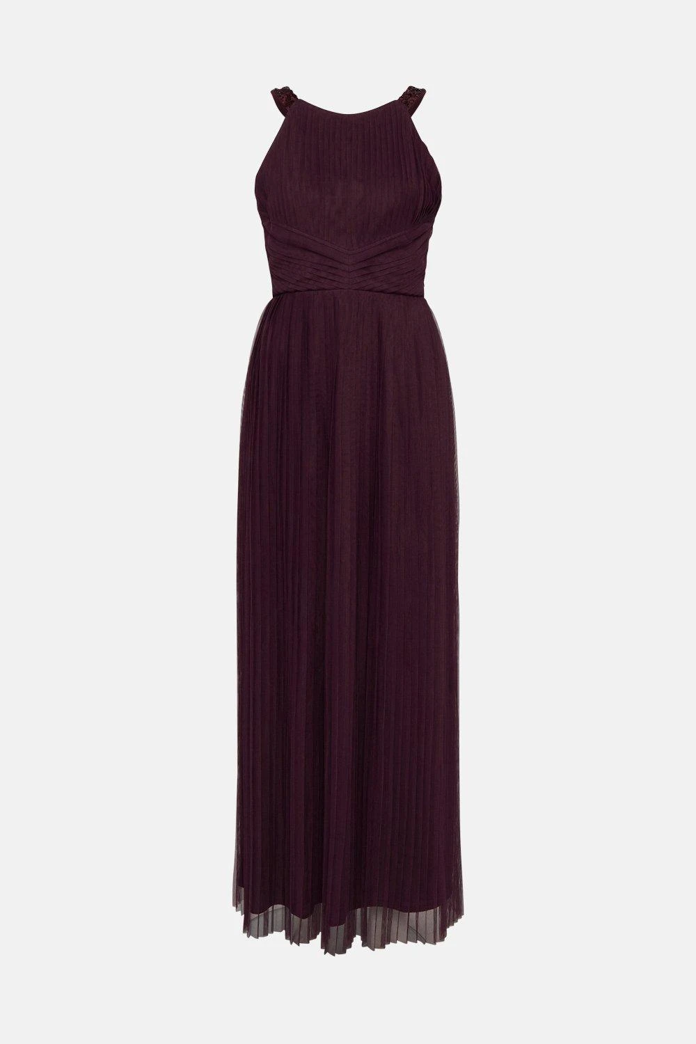 A beautiful dress made for a beautiful bridesmaid, this floor-sweeping design shows off pressed pleats and a sprinkling of crystals adorning the neck. Perfect for a romantic wedding or extra special occasion, it flatters any figure thanks to its classic column shape and sleeveless fit.