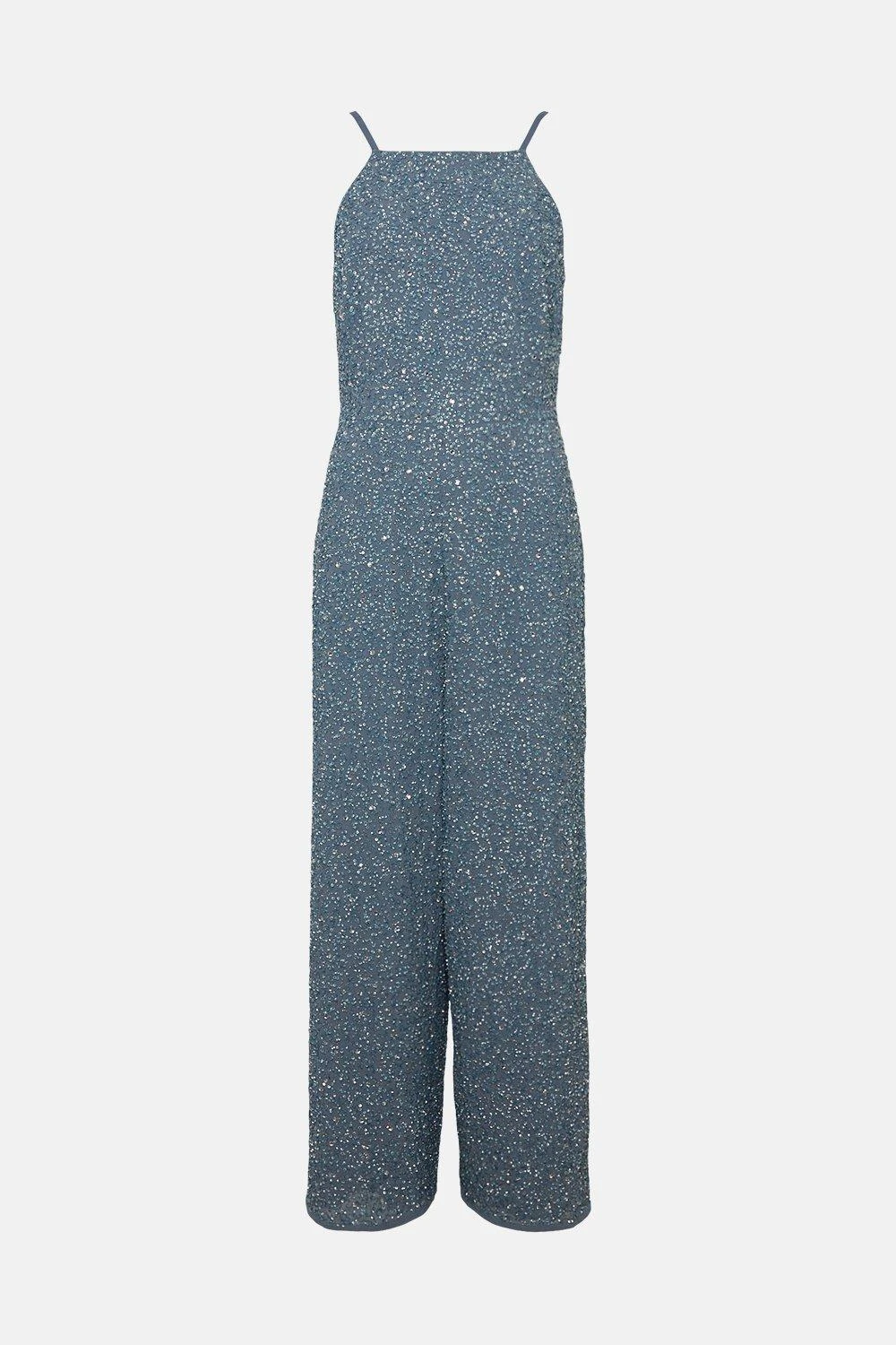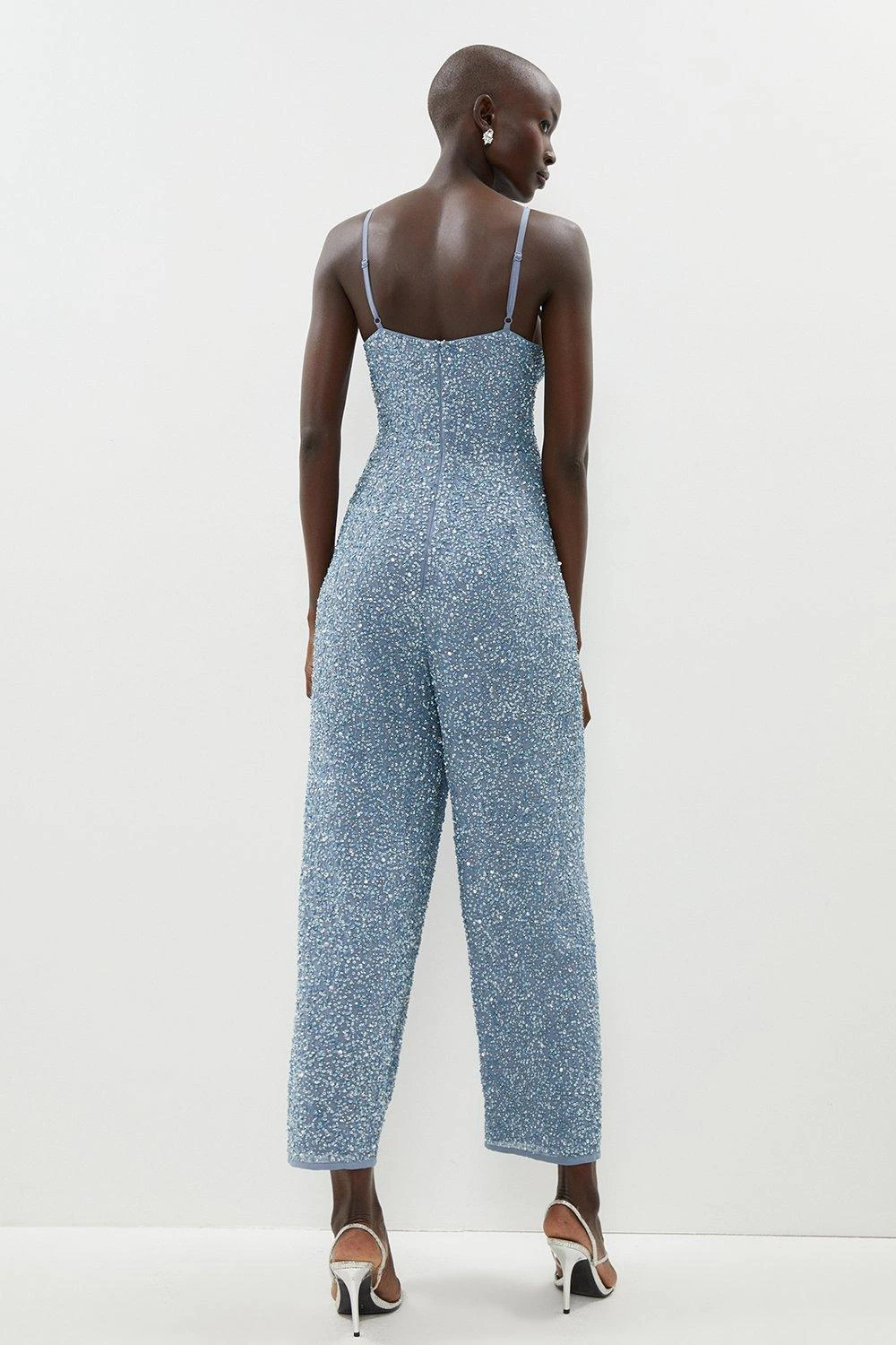 Enlivened with the scintillating depth of mesmerising sequin embellishments, this jumpsuit presents a bold cacophony of tailored elements. It has a square neckline and slim shoulder straps, before landing at a fitted waist that defines the form. Finished with wide legs that drape with languid ease, we harmonise this elegant piece with the sharp form of a classic stiletto.
