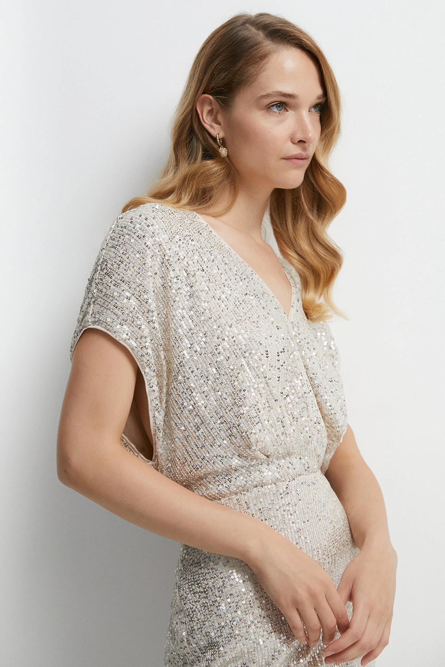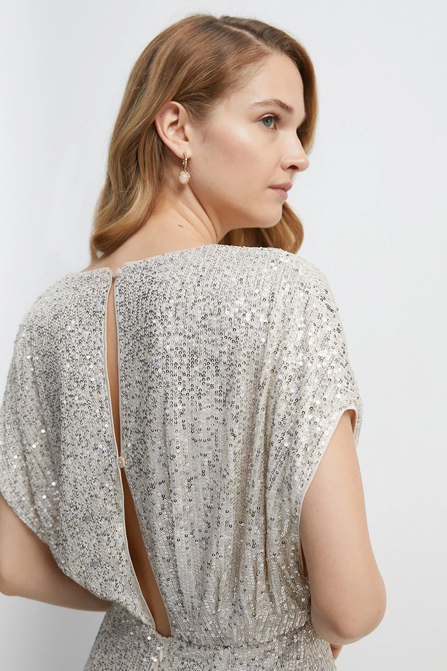 Main: 90% Polyester, 10% Elastane. Tim: Sequin. Lining: 100% Polyester. Dry clean only. Length: 158cm