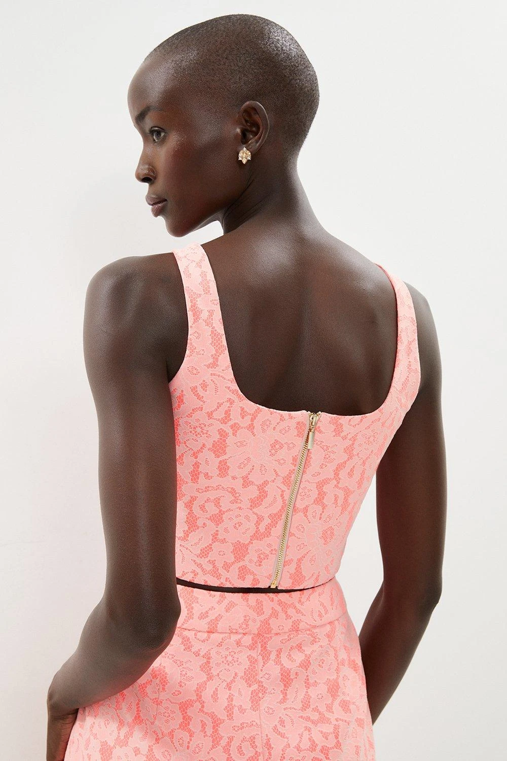 Look to lace to always make an undeniably romantic impression. This cropped bodice is a contemporary twist on the trend, featuring bonded seams and a curved, square neckline. A full-length zip adds a sporty spin to the back.