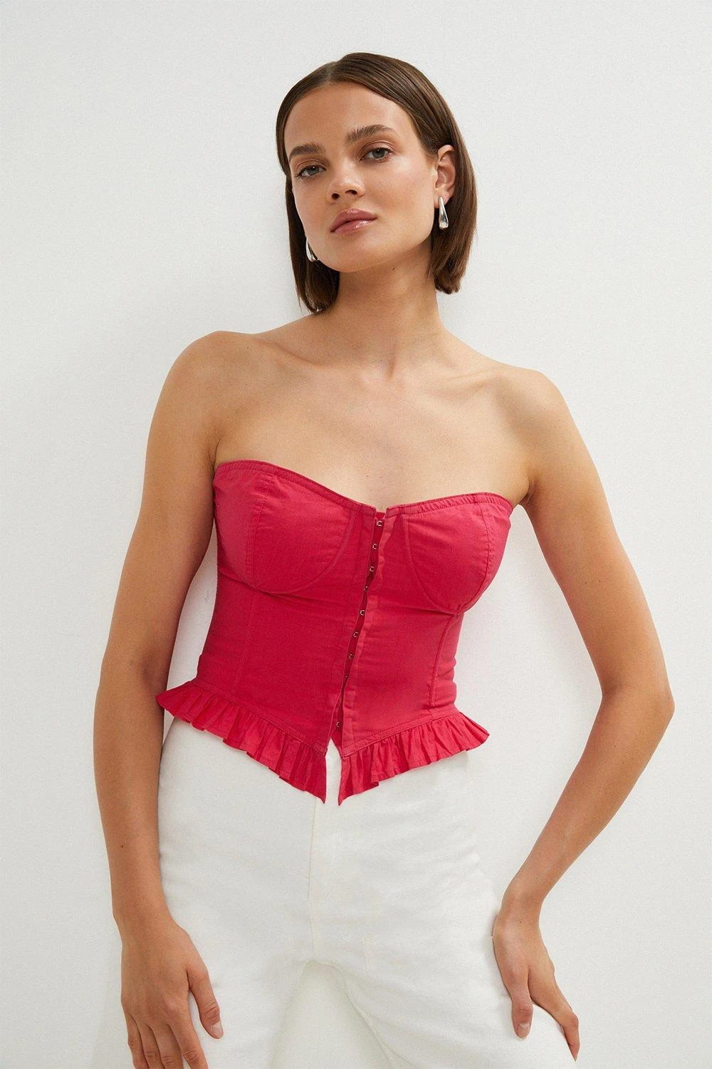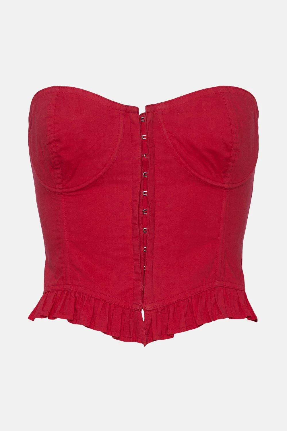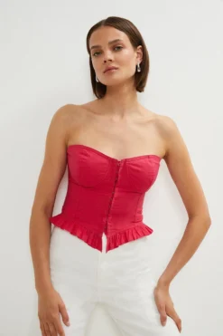 Sumptuously sculpting the form with its seamed structure and lace-up ties, this pure cotton corset was made to show off in. The strapless bandeau neckline comes artfully equipped with softly moulded cups to accentuate your bust and fastens neatly with a utilitarian row of hook-and-eye closures. Ruffled romantically at the hem, it instantly dresses up denim or tailored trousers. Customise the fit courtesy of the traditional crossover ties zig-zagging across the back.