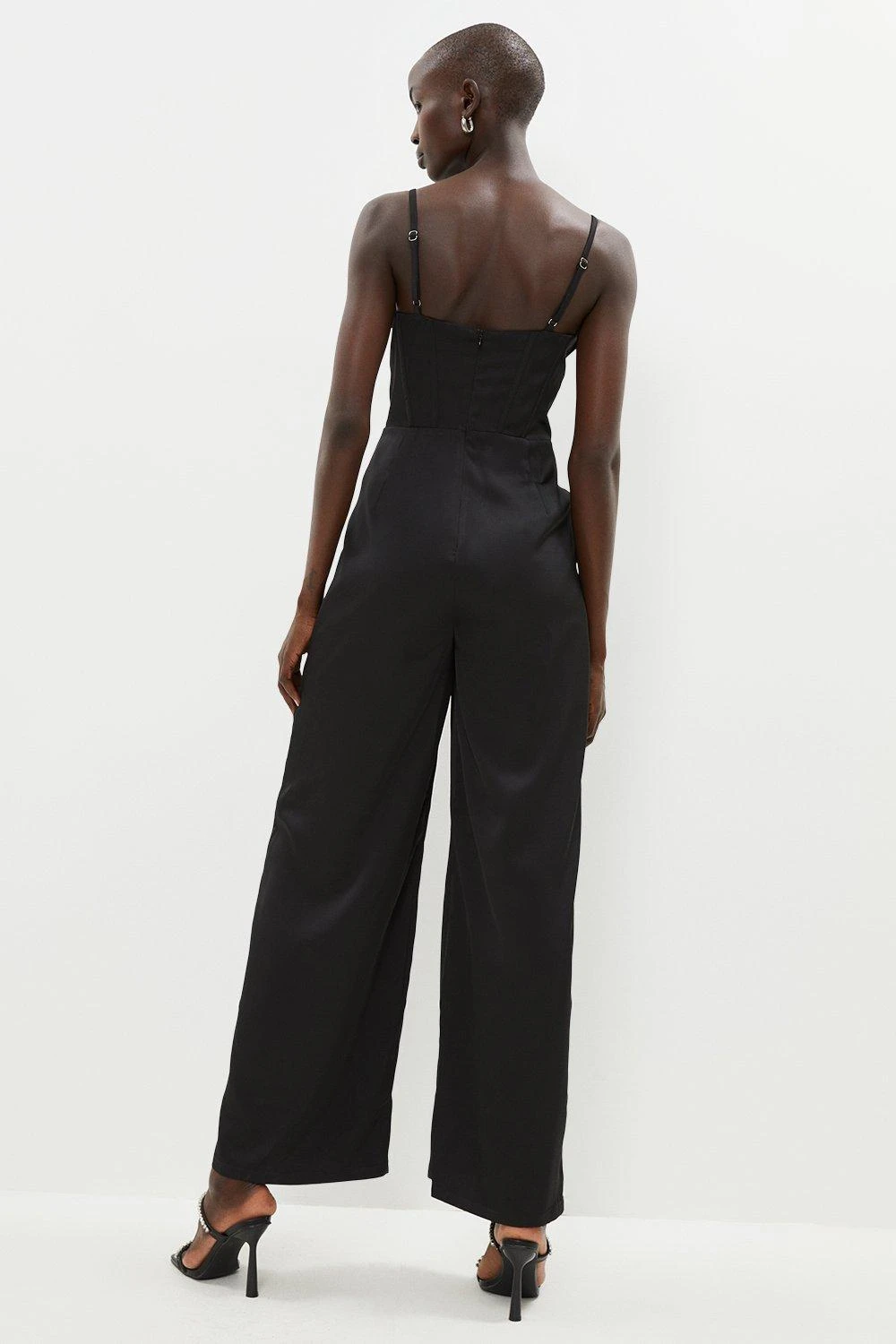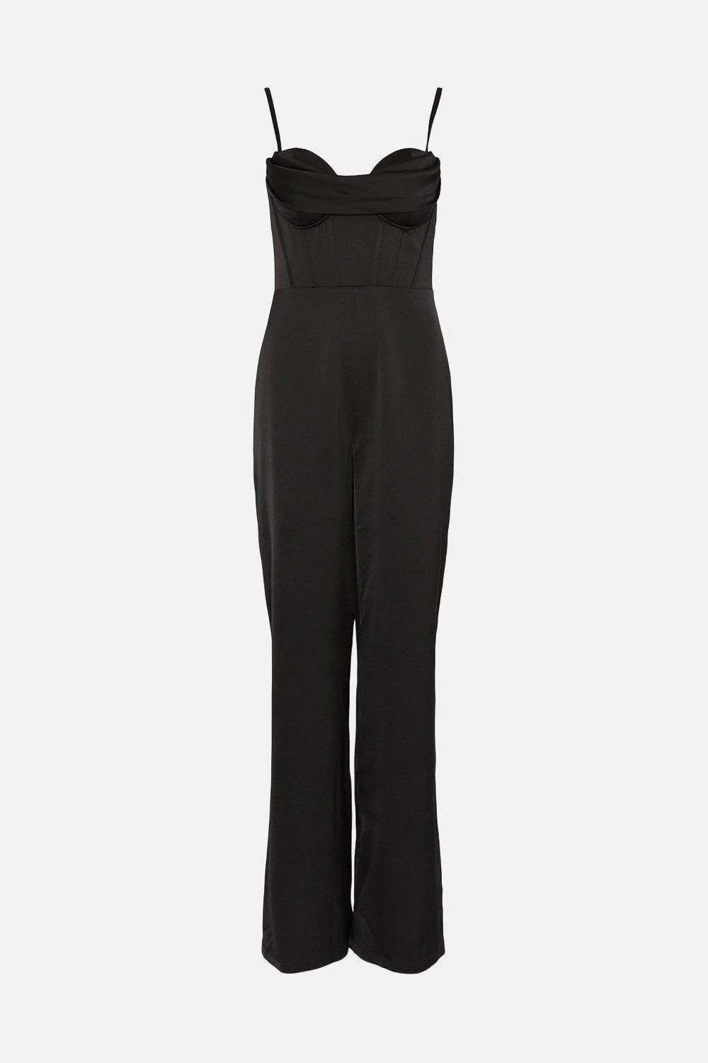 Show you mean business in this sumptuous satin jumpsuit. Defined by its structured cowl neckline, panelled corset and wide-leg trousers, it effortlessly blends feminine details with androgynous tailoring. Take it for cocktails with the addition of embellished heels and a slinky bolero jacket.