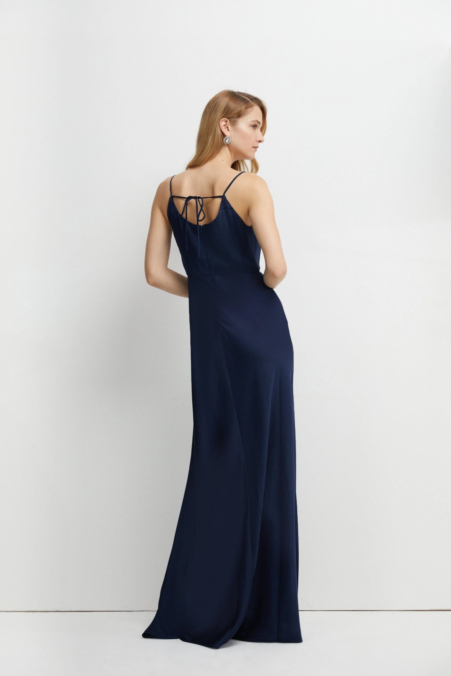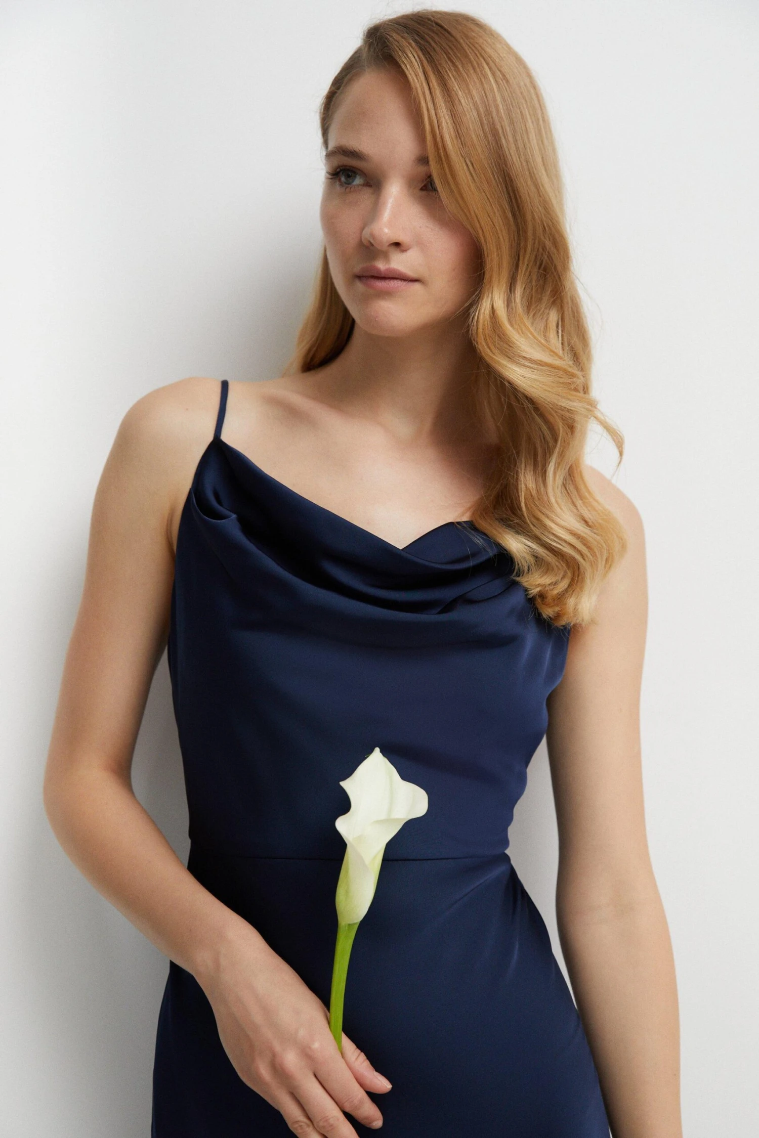 For contemporary weddings, satin choices will add elegance in the best way. Imagined in a cowl neck silhouette with a modern open back, this maxi dress flatters the wearer with its luxurious champagne hue and romantic lines.