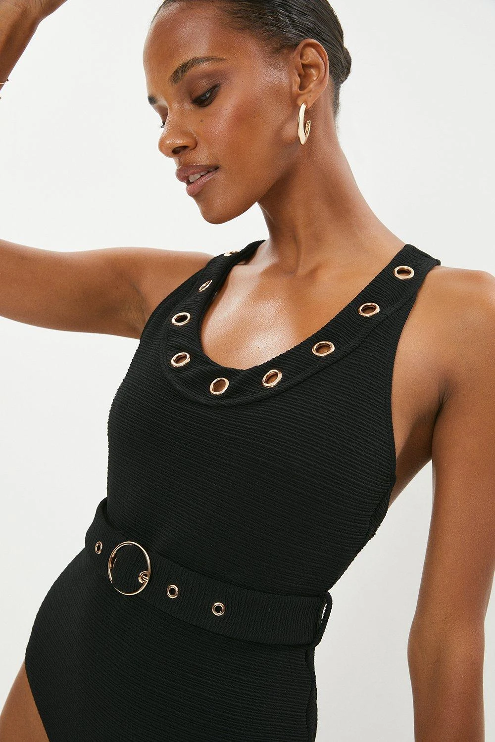 Bond Girl moments come calling when stepping out in this sculpting swimsuit. Punctuated with glossy eyelets and a retro buckled belt, this textured design highlights the waist for a confidence-boosting fit. Thick straps cross over at the back – perfect for showing off sun-kissed shoulders.