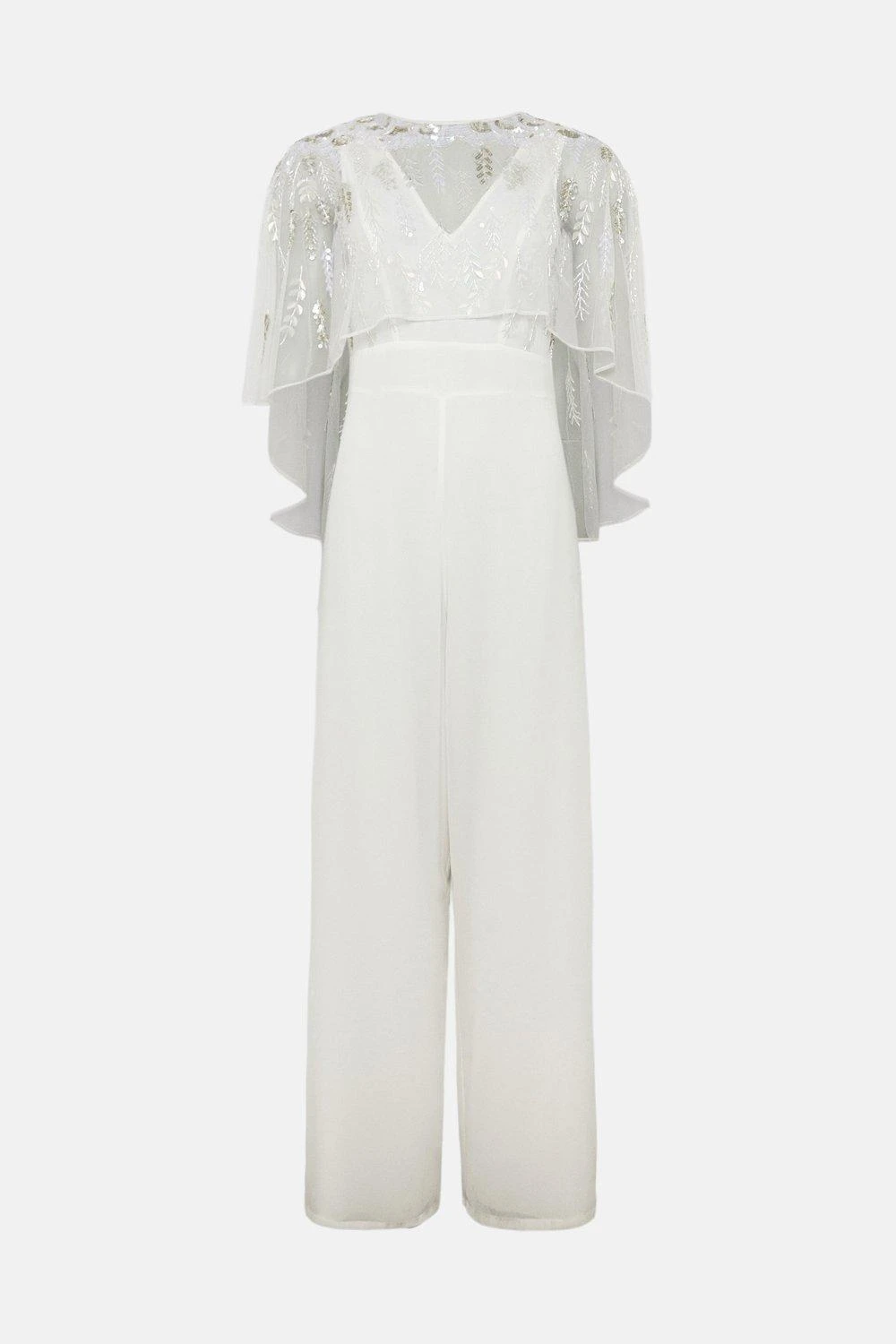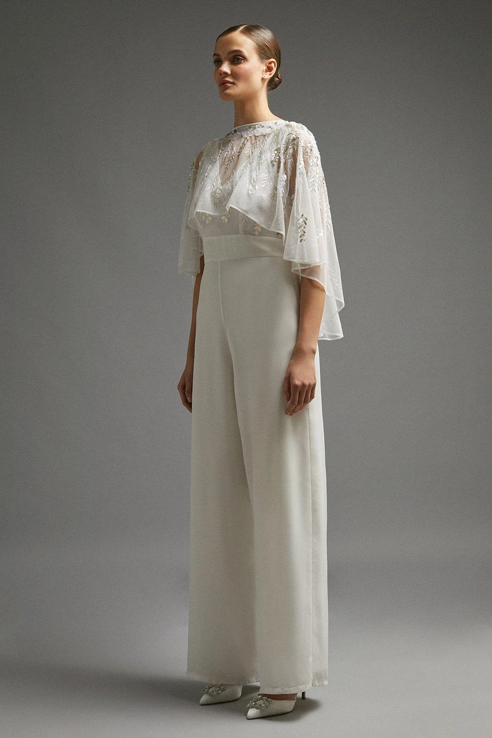 Indulge your ethereal side on your big day. This exceptionally elegant jumpsuit features an embellished V-neck bodice and dramatic wide-leg trousers, accented with a flowing tulle cape sparkling with tonal beads and sequins. Worn alone or with the gauzy cape, it looks gorgeous styled with a simple up-do and satin stilettos.