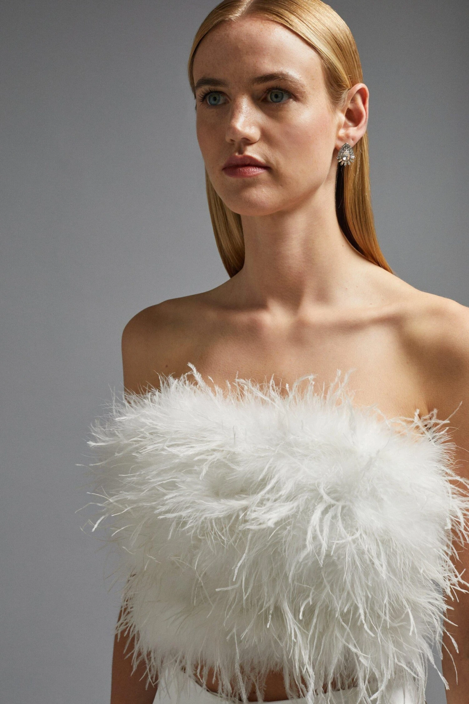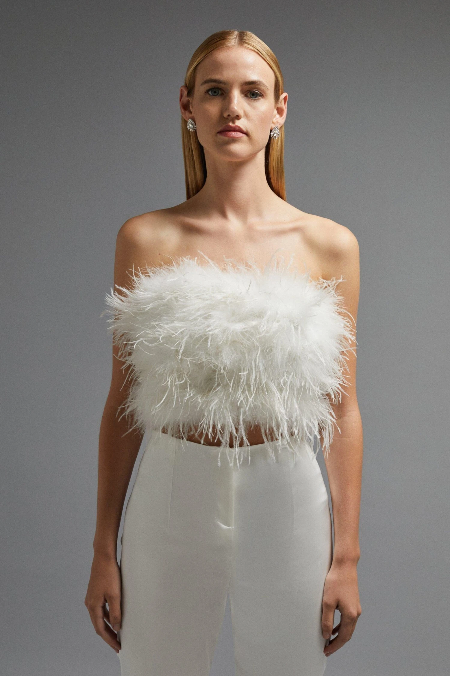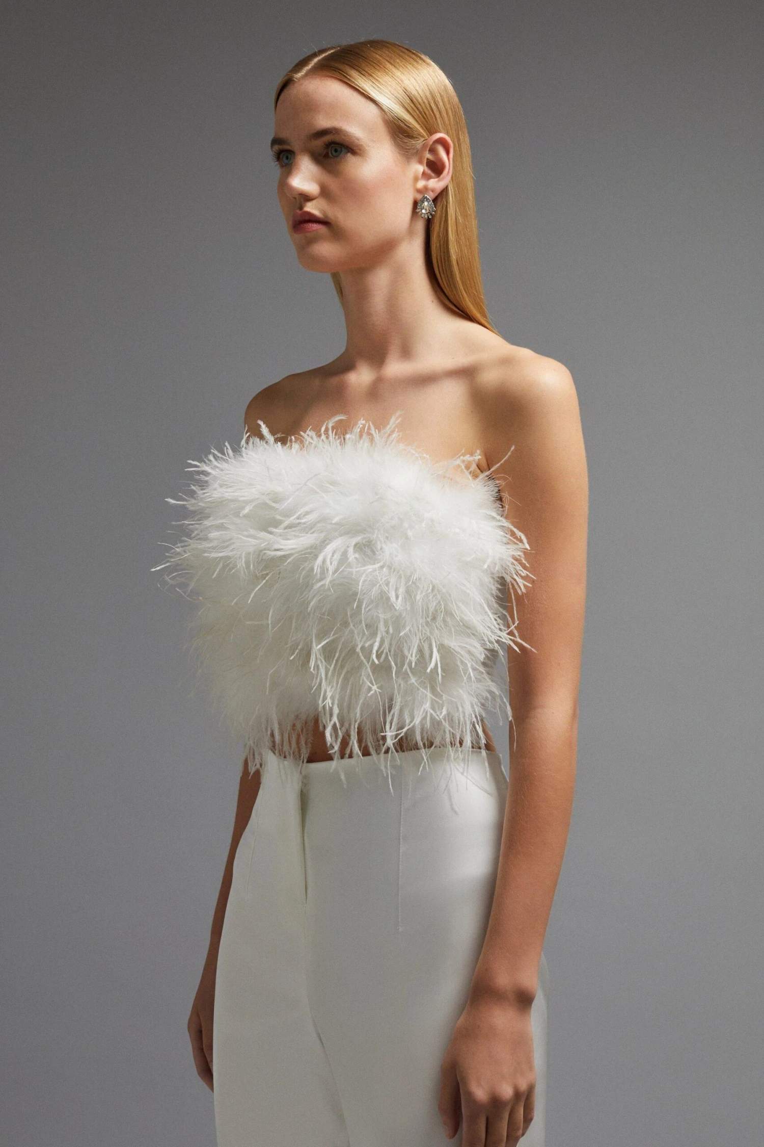 Say it with feathers. The perfect fanciful addition to your big day, this frothy bandeau top is the perfect piece to reach for when hitting the dance floor at your wedding reception. It fastens with a neat zip at the back, floating elegantly on the bust for a flamboyant, celebratory finish.
