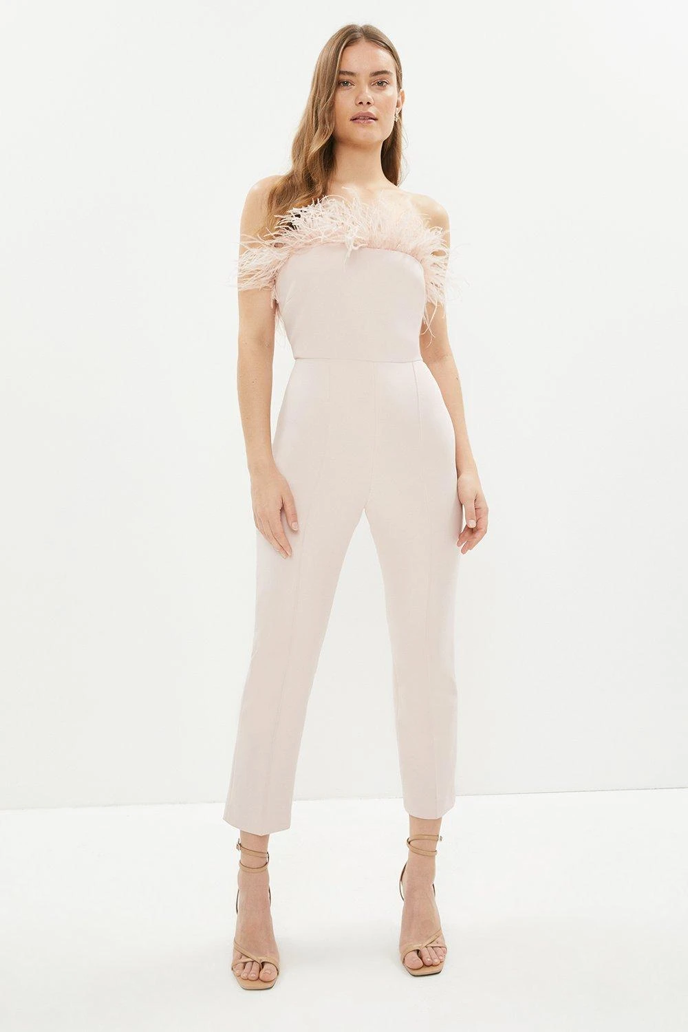 Main: 89% Polyester, 11% Elastane. Lining: 100% Polyester. Trim: 100% Ostrich Feathers. Dry Clean Only. Length 114cm.