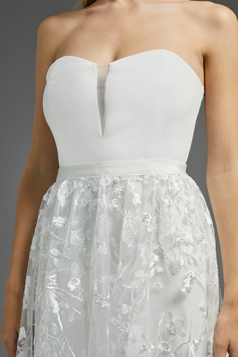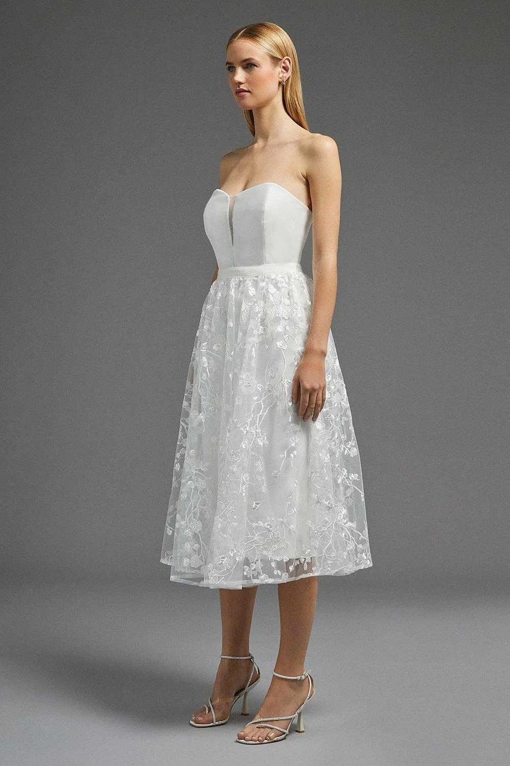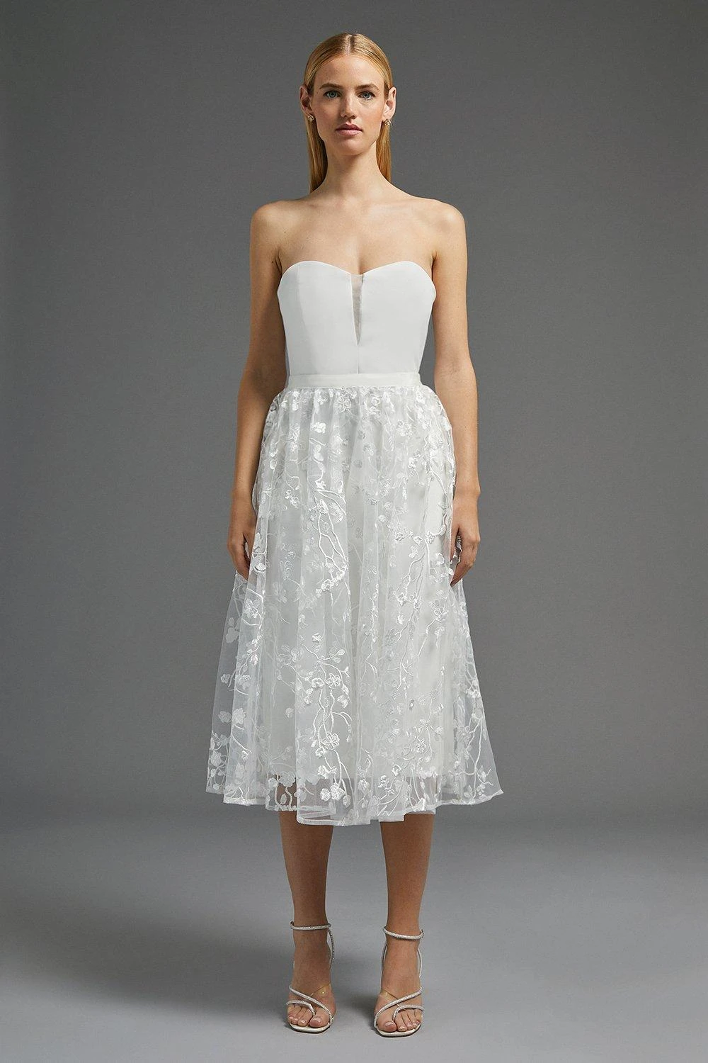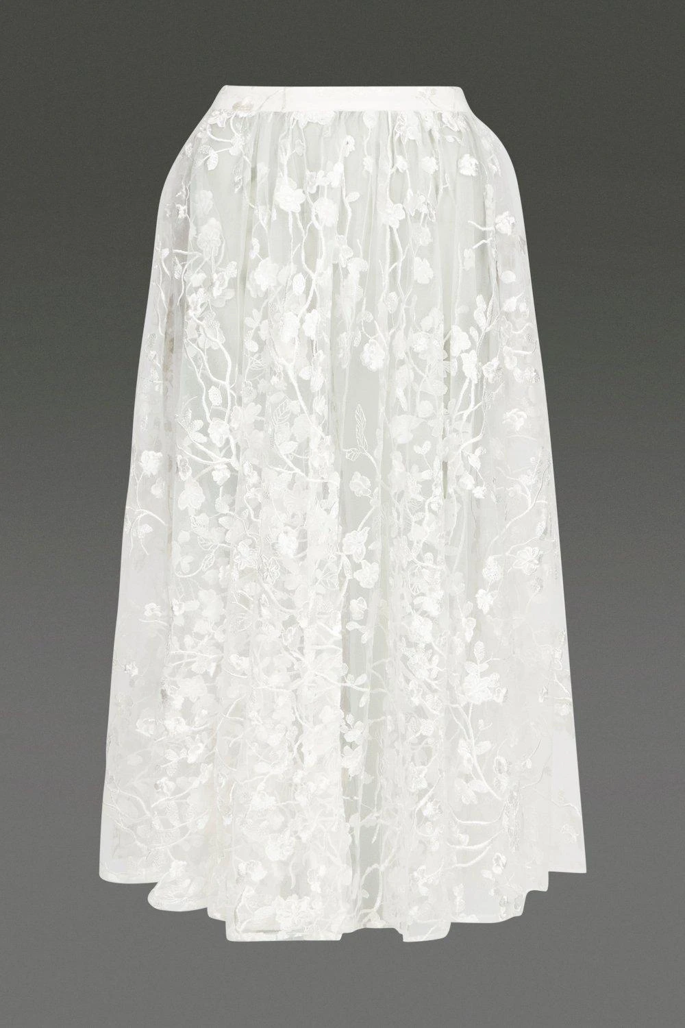 Perfect for switching up your look on your special day, this gauzy embroidered midi skirt layers simply over your wedding gown. It features a satin ivory waistband to cinch in your silhouette along with a semi-sheer finish sure to bring the romance.