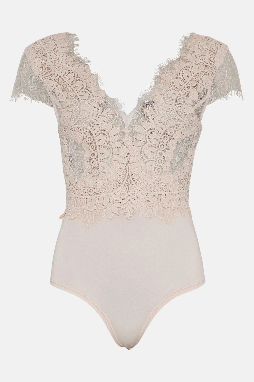 Cut a clean-lined silhouette in this elegant lace bodysuit. Designed to skim curves, it features a V-neckline, short sleeves and a neat, tucked-in design that frees you from unsightly fabric lines.