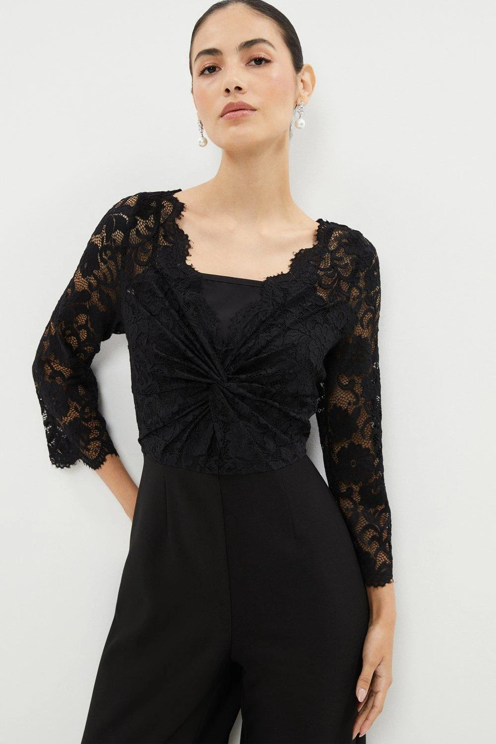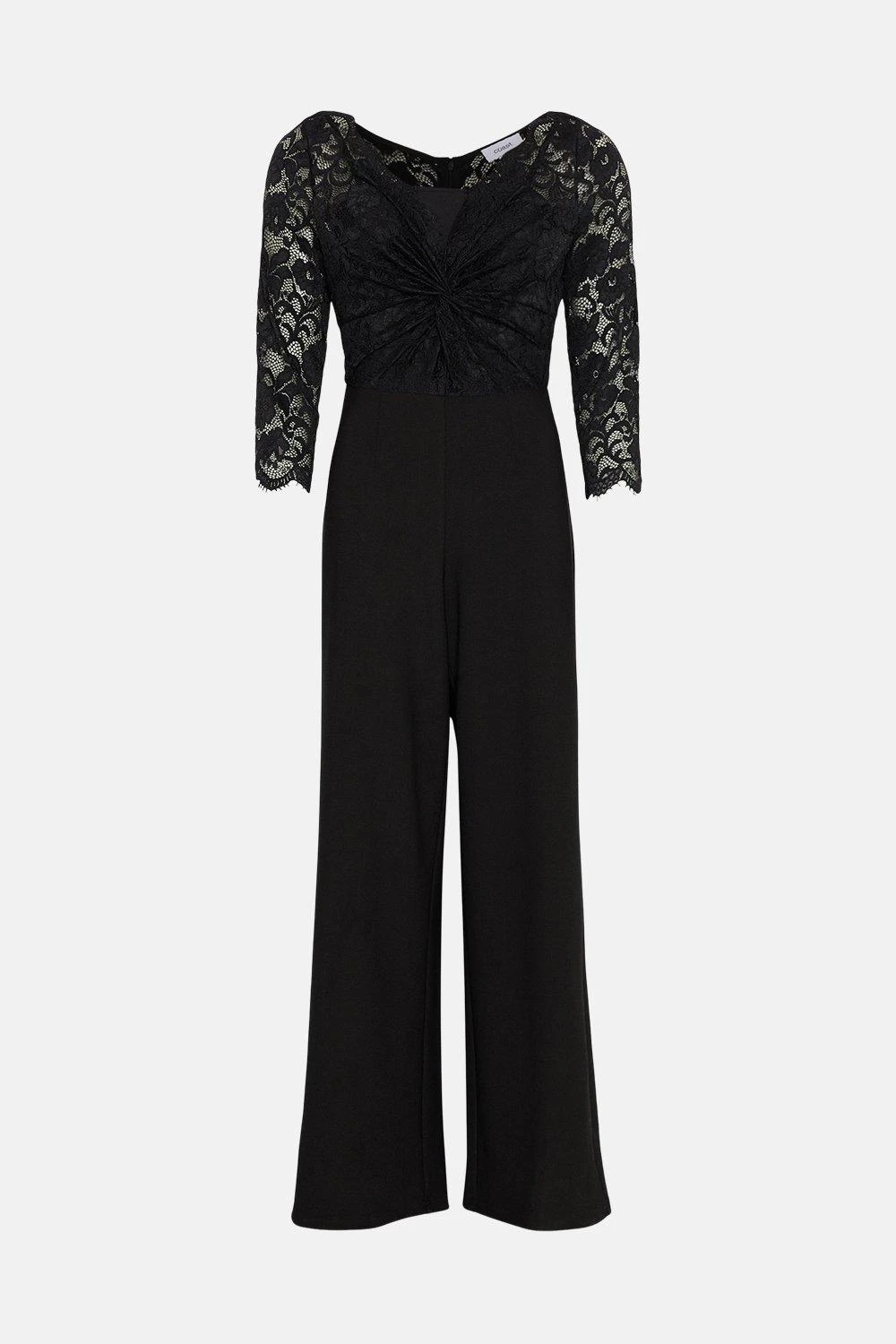 Made to be celebrated, this regal jumpsuit combines a twisted lace overlay with modern wide-leg trousers. Both smart and sophisticated, it looks best worn with understated accessories like delicate pearl earrings.