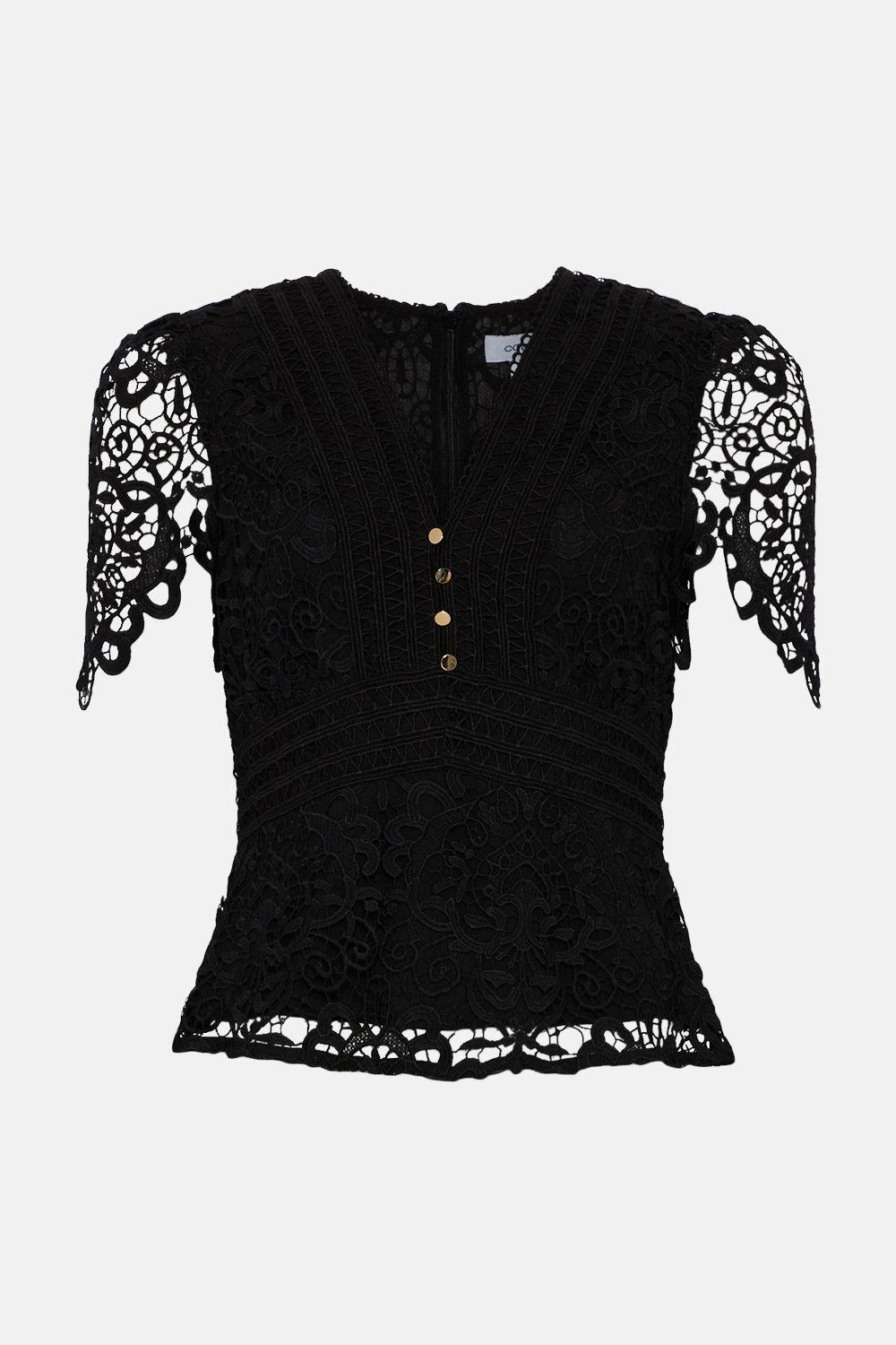 Femininity is envisioned with bold contemporary direction for this captivating blouse. Blooming with ornate lace detailing, it has angled short sleeves that land at intricate eyelet-embellished trims – offset by a sharp V-neckline that’s bordered with rows of lace. Punctuated with polished gold tone buttons, it sculpts the form with a confident construction before flowing into a peplum hem.