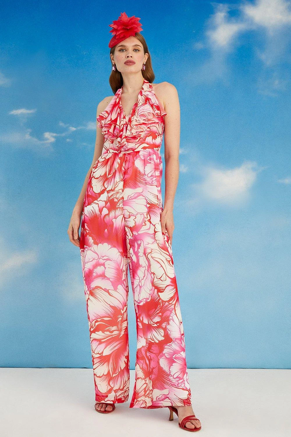 Part of the Lisa Tan x Coast collaboration. This jumpsuit is enlivened by a print of vibrant blooms and cascades of cleverly placed ruffles. In a halter silhouette that sculpts your torso and flares to elongating palazzo trousers with elasticated panels at the back, expect a flattering look every time.