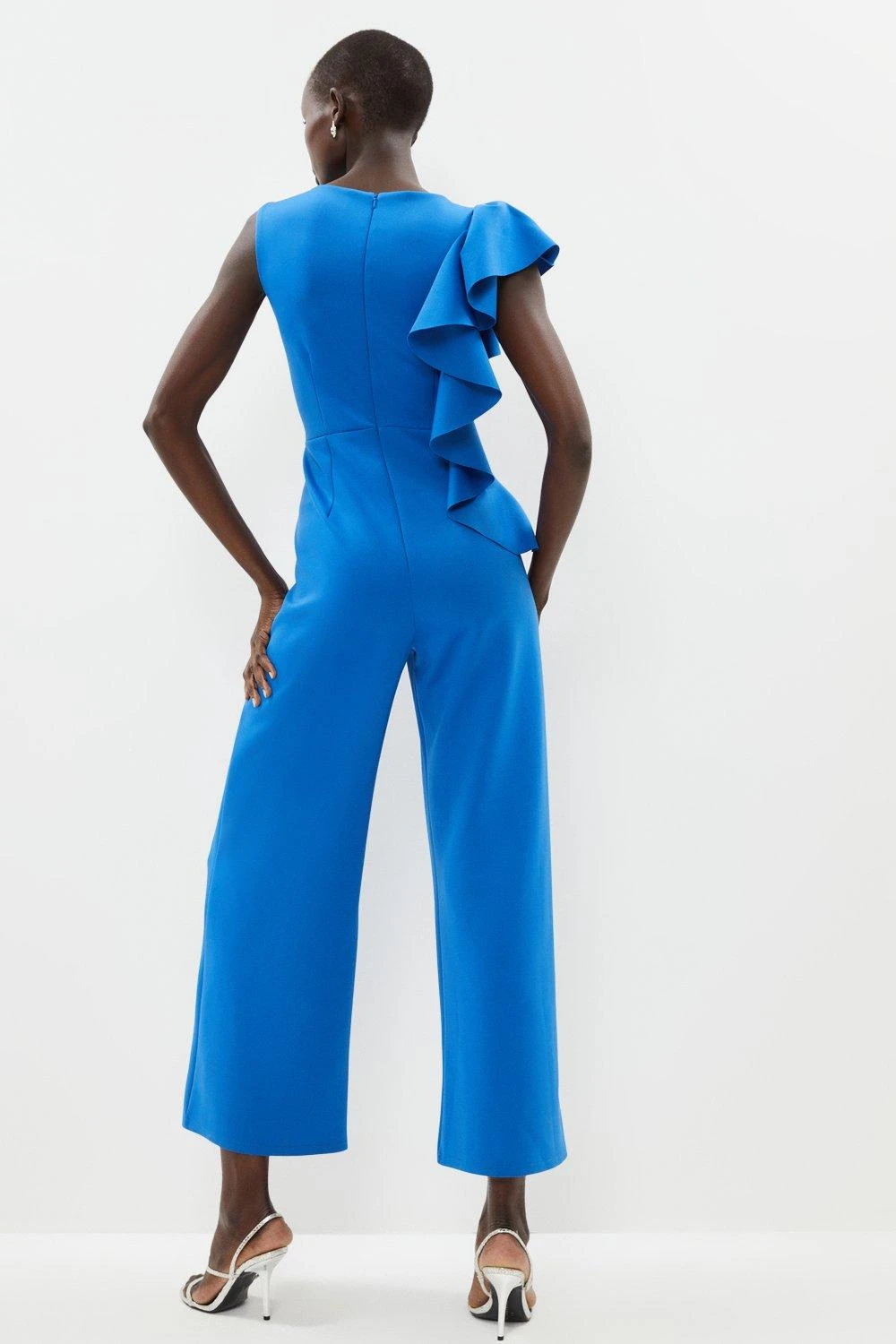 A style with serious wow factor, this polka-dot wide-leg jumpsuit comes crafted from softly structured scuba fabric and features a dramatic ruffle framing one sleeve. An undeniably bold choice for special occasions, it?ll leave everyone asking, ?where did you get that??
