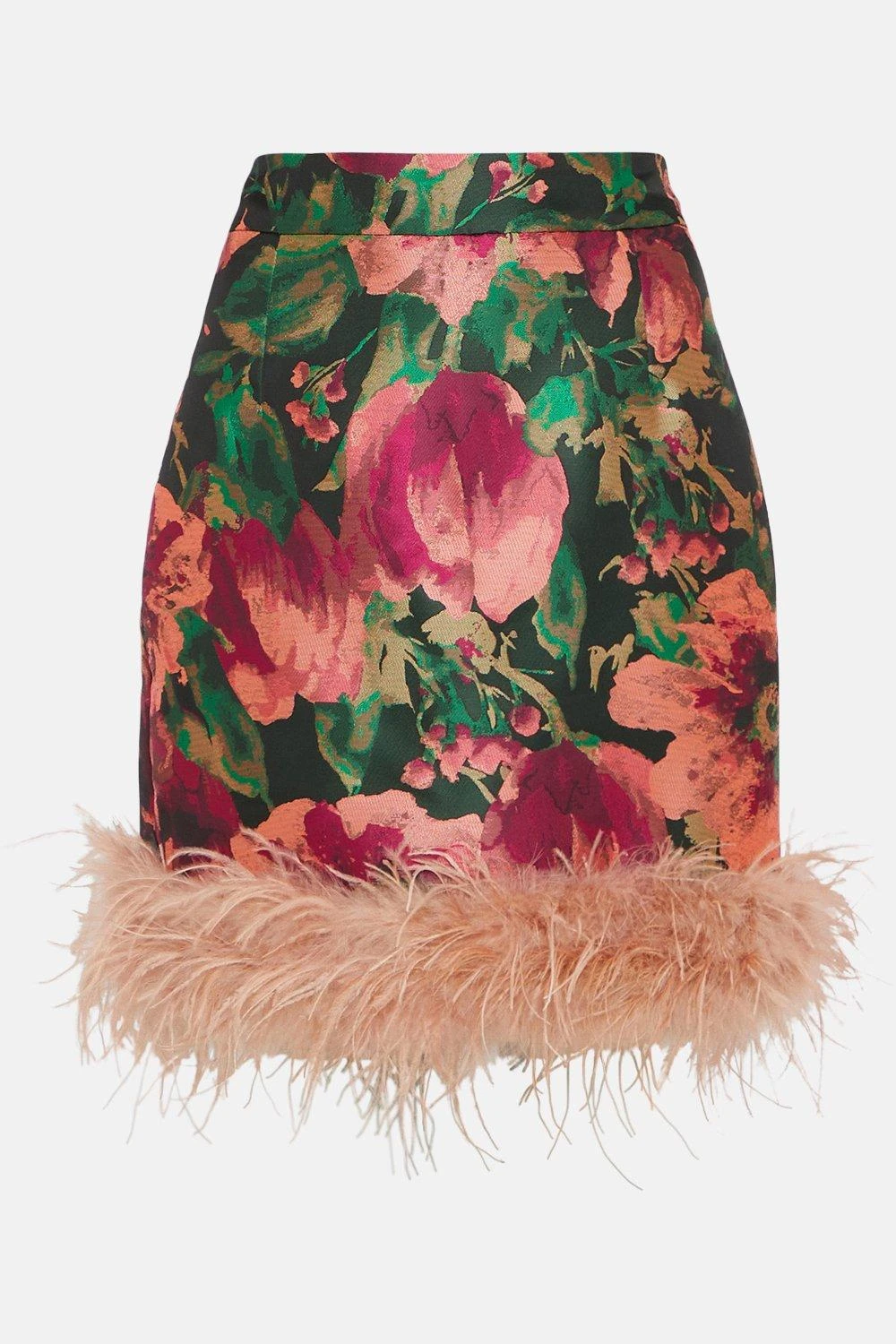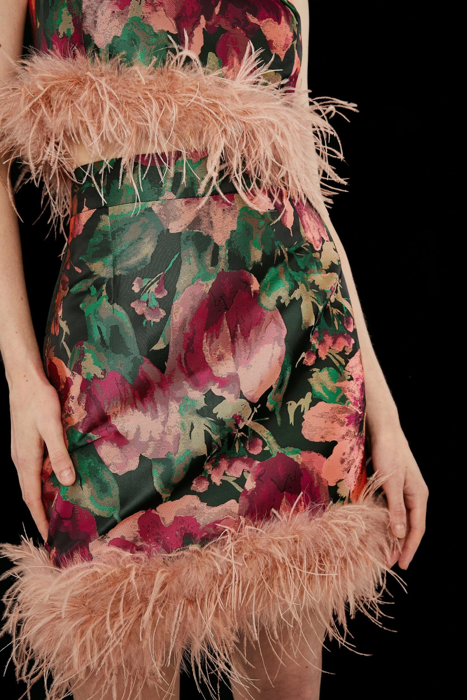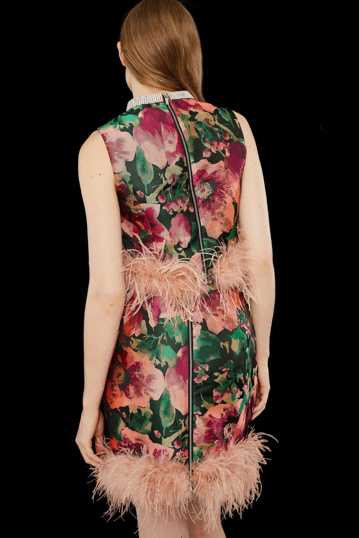 Main: 100% Polyester. Lining: 100% Polyester. Trim: Feathers. Dry Clean Only. Length 49cm.