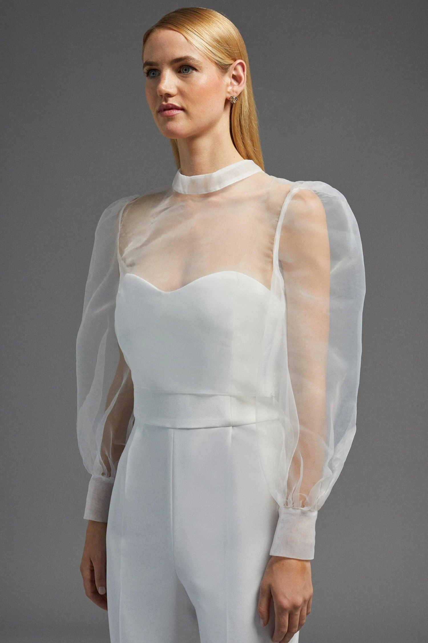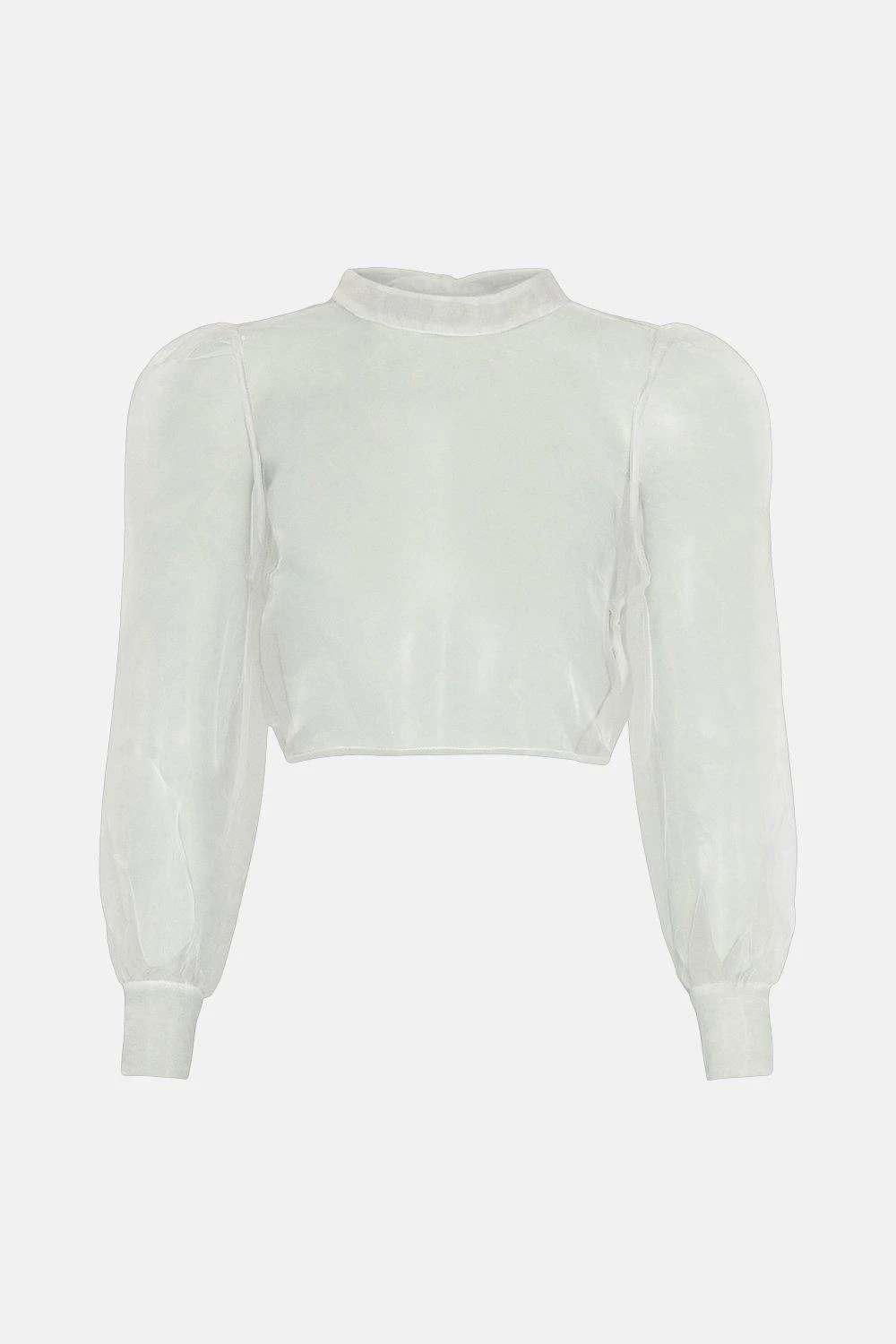 Bridal opulence, guaranteed. This dramatic tulle top shows off puffed sleeves and a high, round neckline for a modern finish. Perfect for adding a customised twist to your bridal ensemble, it comes trimmed with a feminine bow at the back of the neck along with fabric-covered buttons at each cuff.