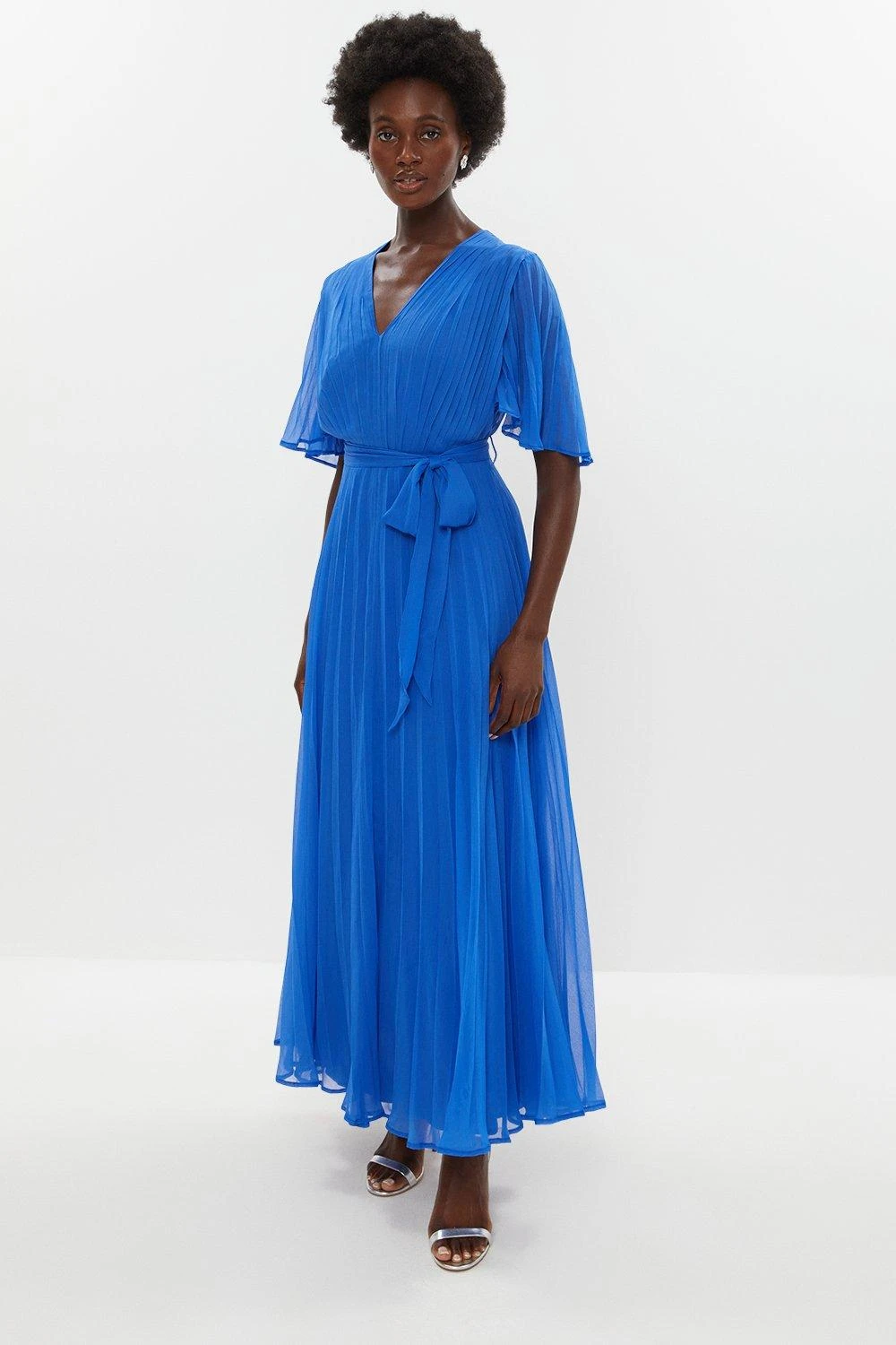 Nothing sets the style bar as high as pressed pleats and they abound alluringly on this versatile V-neck dress. Perfect for a wedding or balmy-day BBQ, it shows off fluttery sleeves and a frothy bow in a contrast colour to subtly cinch in the maxi-length silhouette.
