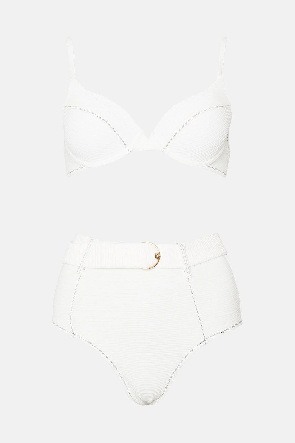 Be ready for your very own Bond Girl moment in this striking white bikini. The moulded top features supportive cups to enhance your bust, along with slim shoulder straps and a back bow closure. Full-coverage bikini bottoms complete the look, sitting high up on the waist for a demure, ‘50’s-style finish further enhanced by the addition of a circular clasped belt.