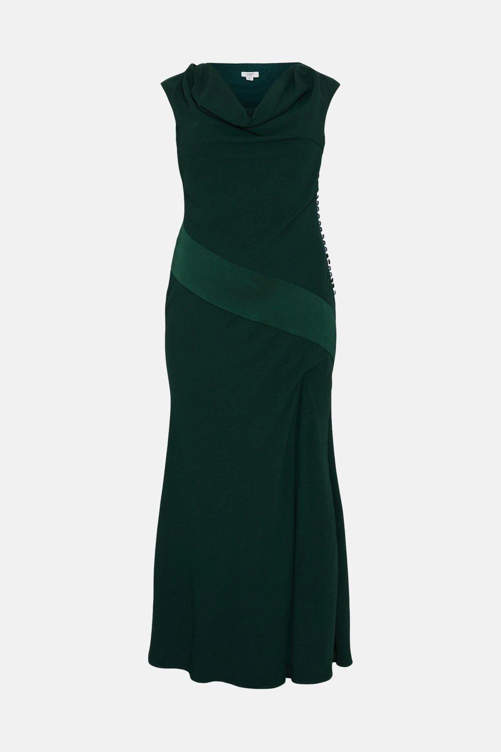 A decidedly dramatic choice for your next black-tie ball, this sweeping satin maxi dress showcases a draped cowl neckline, neat row of fabric-covered buttons and sultry diagonal panel in a sumptuous fabric. Fitted with a seductively high hem split, it adds instant drama to special occasions.