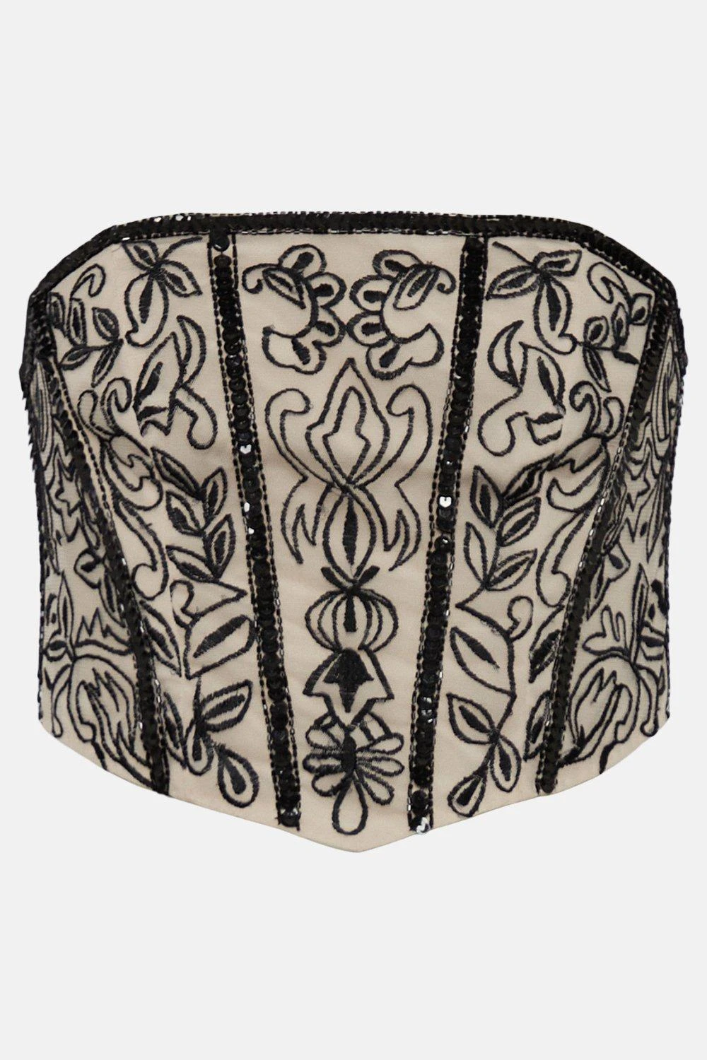 Meticulously embellished with light-catching beads, this premium corset top adds artisanal charm to plain separates. It shows off a classic, bandeau-style silhouette that comes cropped for a contemporary finish, making it the perfect plus-one for tailored wide-leg trousers and heels.