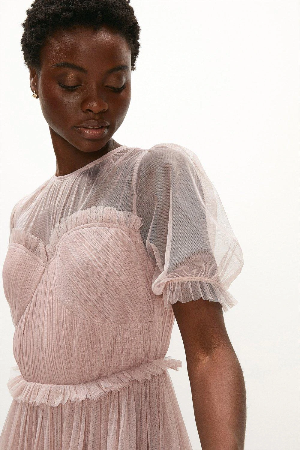 Made for your very own moment in the spotlight, this dreamy tulle confection combines frothy tiers with romantic puffed sleeves and a shirred, sweetheart bodice. Enhance the breathtakingly beautiful silhouette with metallic heels and dramatic drop earrings for a party look to remember.