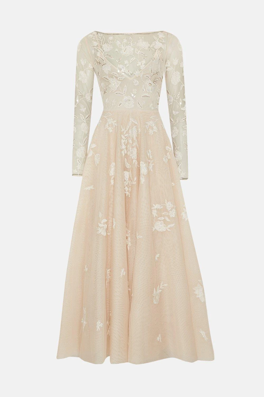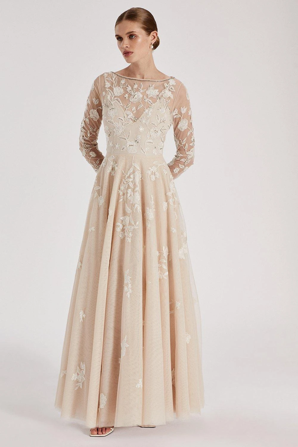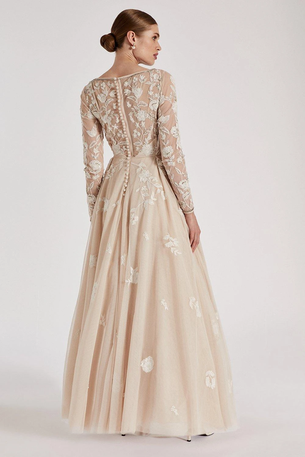 Part of The Royal School of Needlework x Coast collection. A traditional silhouette adorned with expert embroidery work consisting of floral details, inspired by the Wildflower artwork. Featuring a romantic sheer overlay to capture a truly feminine essence.