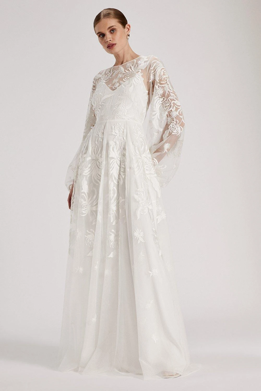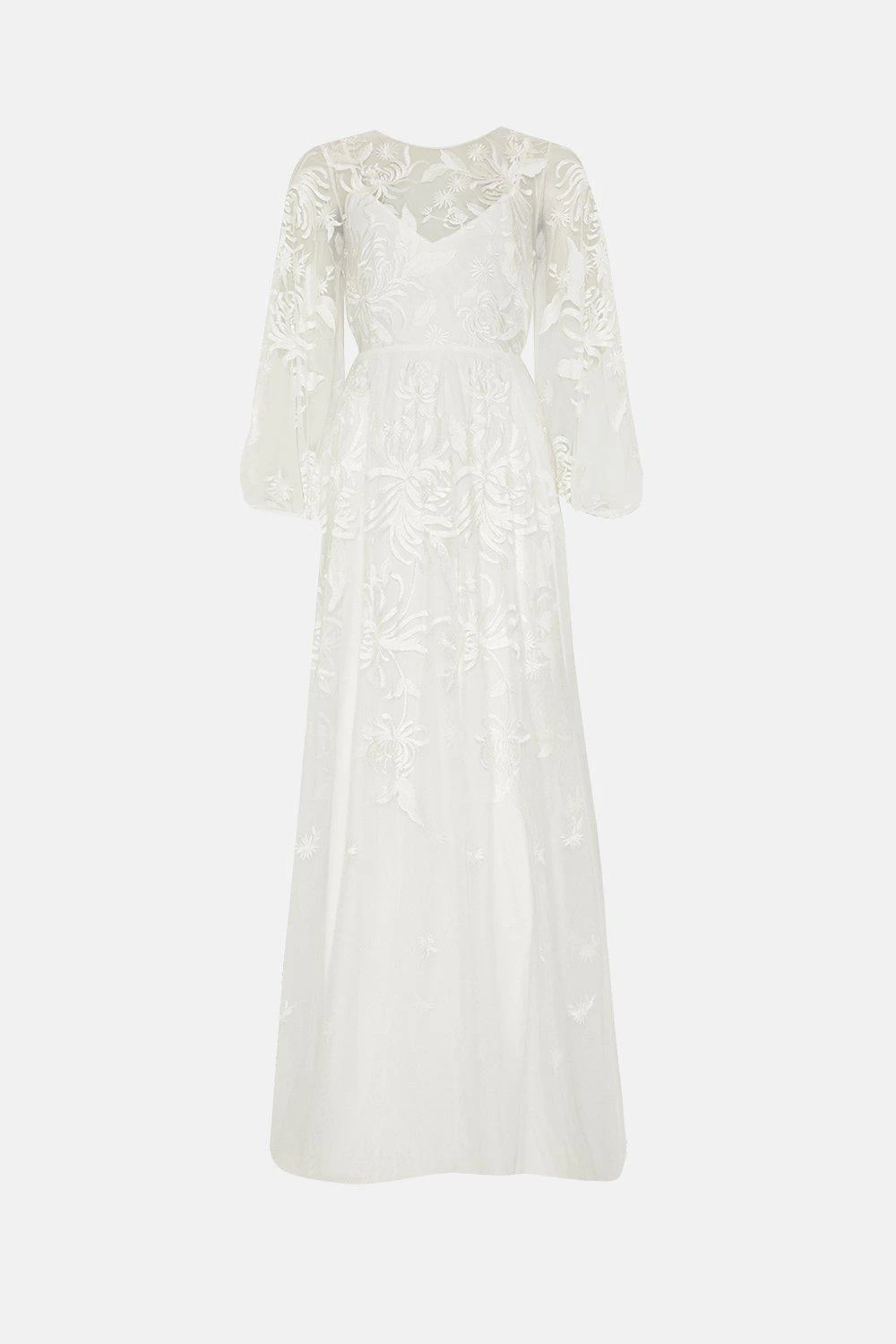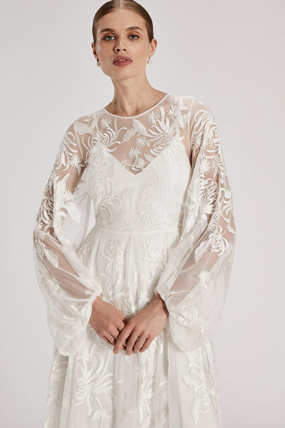 Part of The Royal School of Needlework x Coast collection. A gown inspired by the artwork of the Kyoto piece, this floor-sweeping dress is both mesmerising and subtle. Adorned with floral applique and detailed embroidery, cut with balloon sleeves and flattering silhouette.