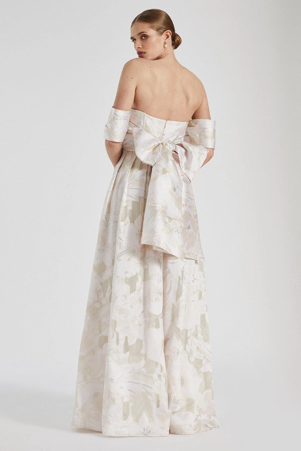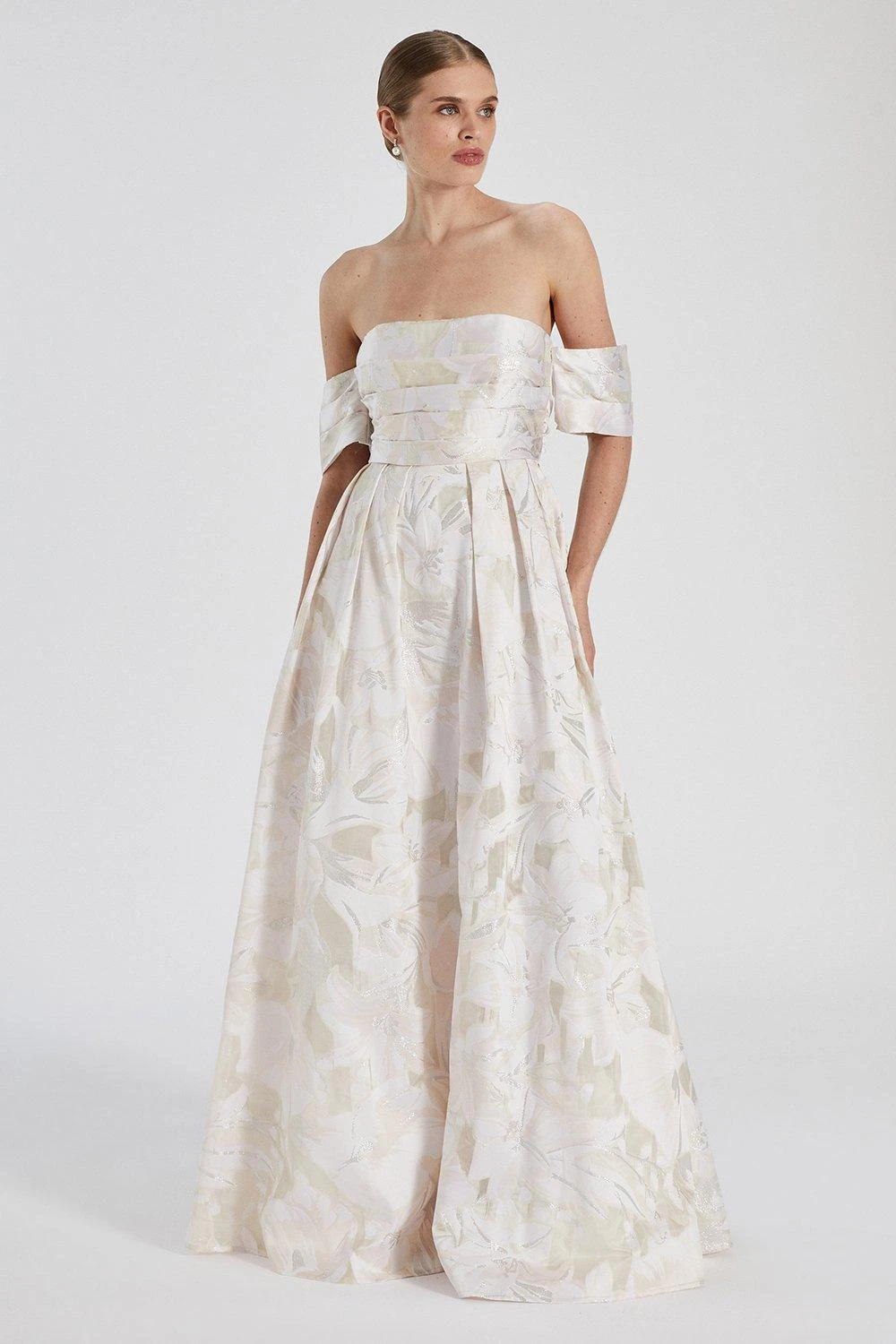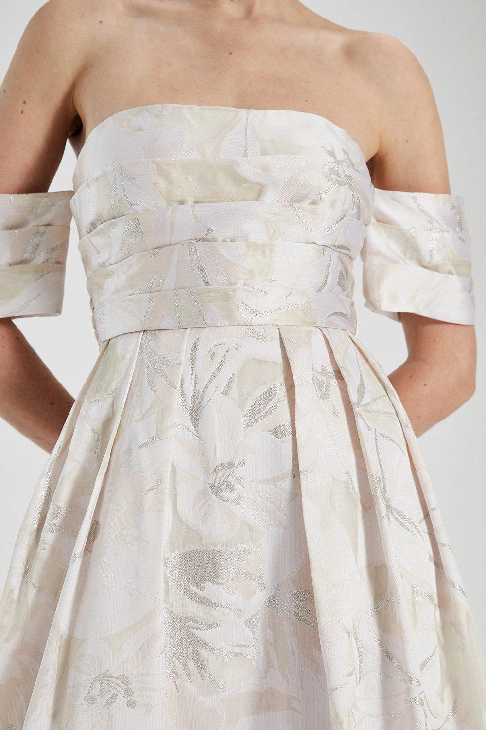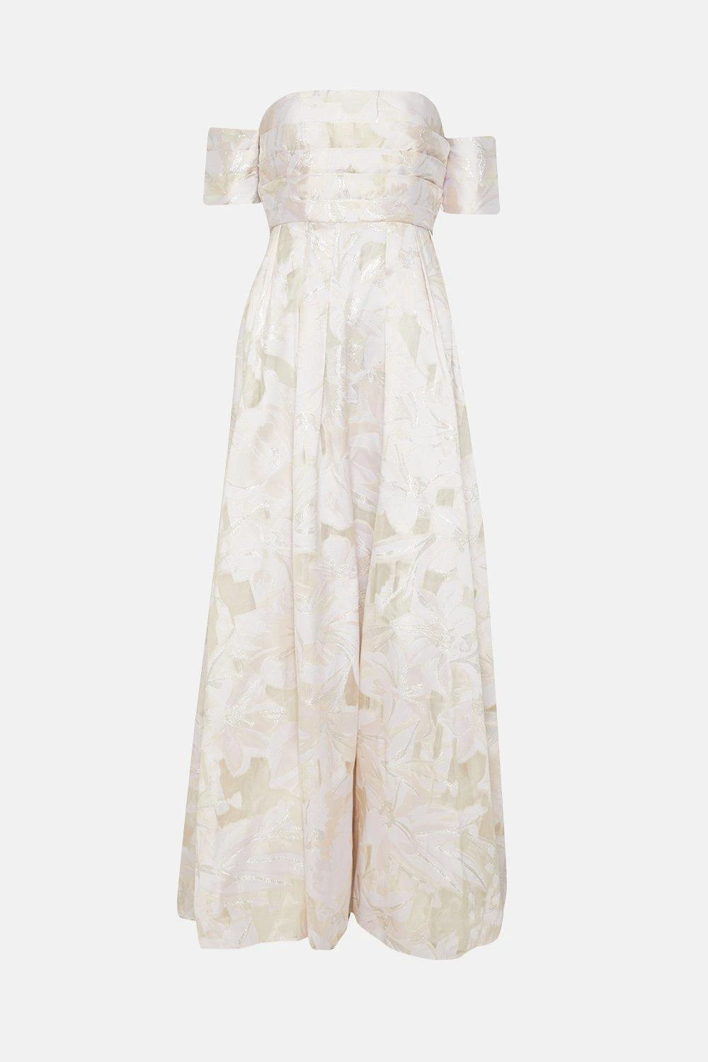 Part of The Royal School of Needlework x Coast collection. Taking you from ceremony to reception, this beautiful bridal dress boasts a flattering fit-and-flare silhouette with a Bardot neckline and full maxi skirt. Crafted in organza jacquard with ornate embroidery, this dress is made for romantic brides, inspired by the Lily artwork.