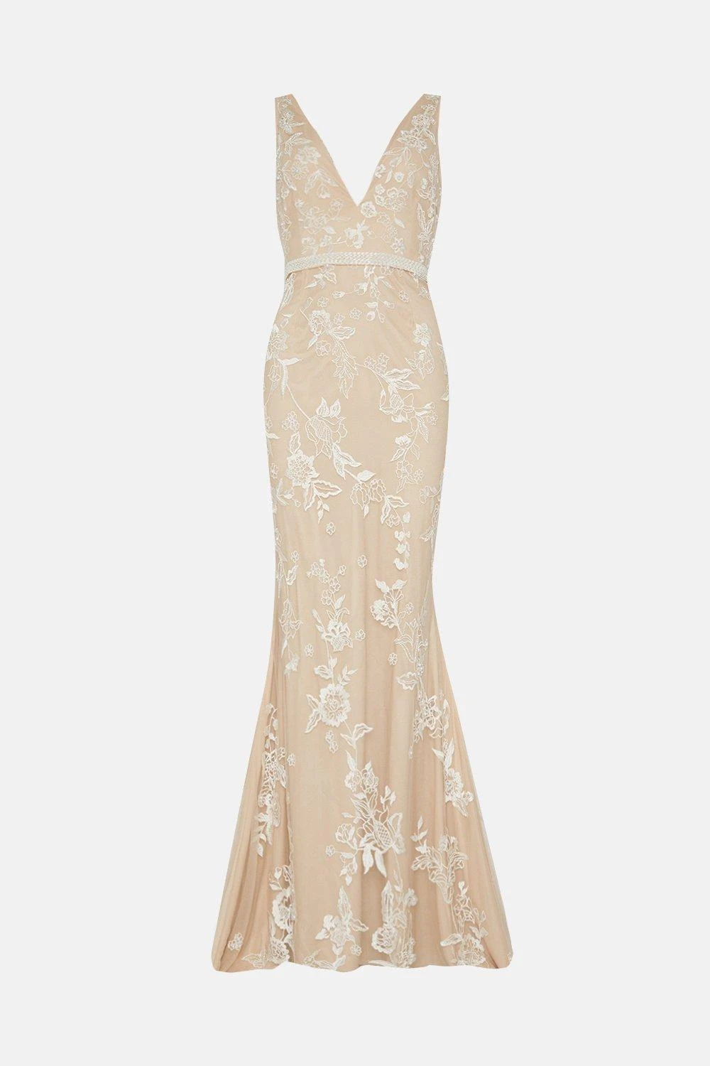 Part of The Royal School of Needlework x Coast collection. Boasting beautiful embellishments on a sultry silhouette, this bridal dress has been designed with glamourous brides in mind. Showing off a figure-hugging fishtail silhouette, it’s elevated with a plunging neckline and maxi length. With design details inspired by the Wildflower artwork.