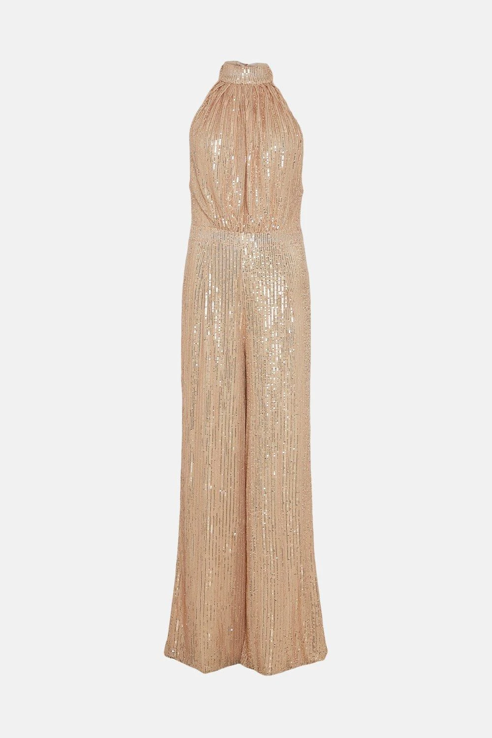Get set to make a stuning entrance. This statement-making jumpsuit pairs a sparkling, sequinned bodice with matching wide-leg trousers for a thoroughly modern feel. Defined by its feminine halter-neck tie and open back, it strikes a beautifully retro style note on the dance floor and beyond.