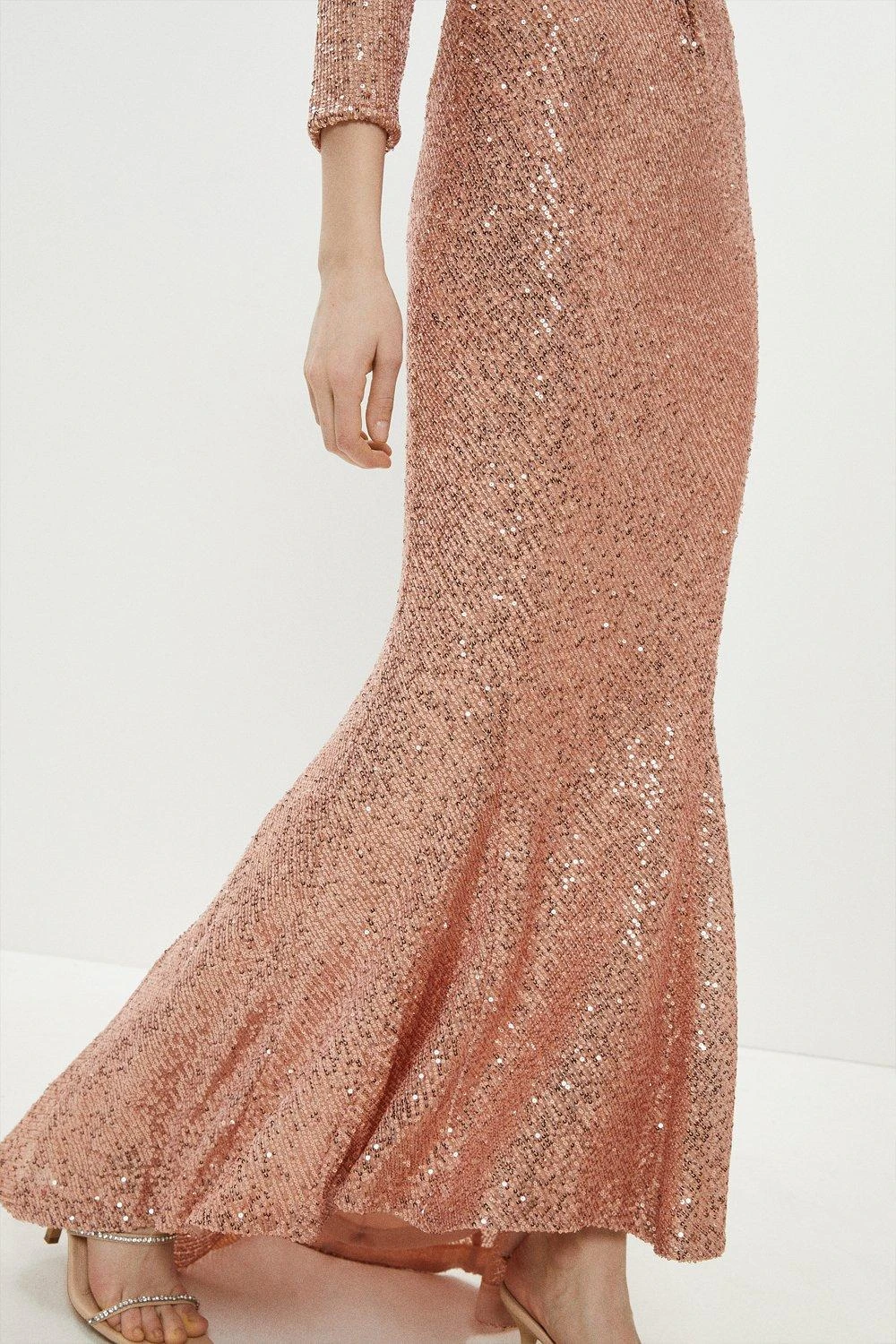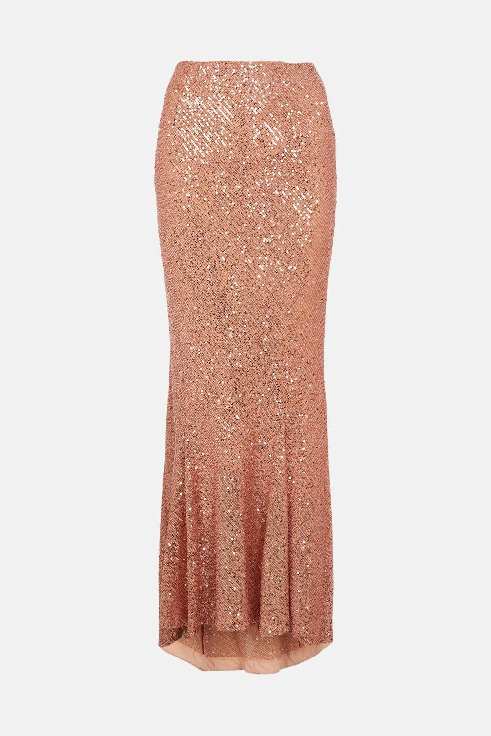 Get set to sparkle. Adorned all over with tonal sequins, this mermaid-style maxi skirt sweeps dramatically into special soirees and features a curved, fishtail hem for added swish.