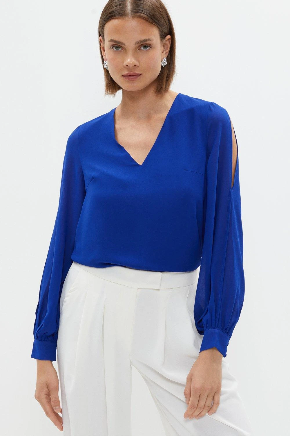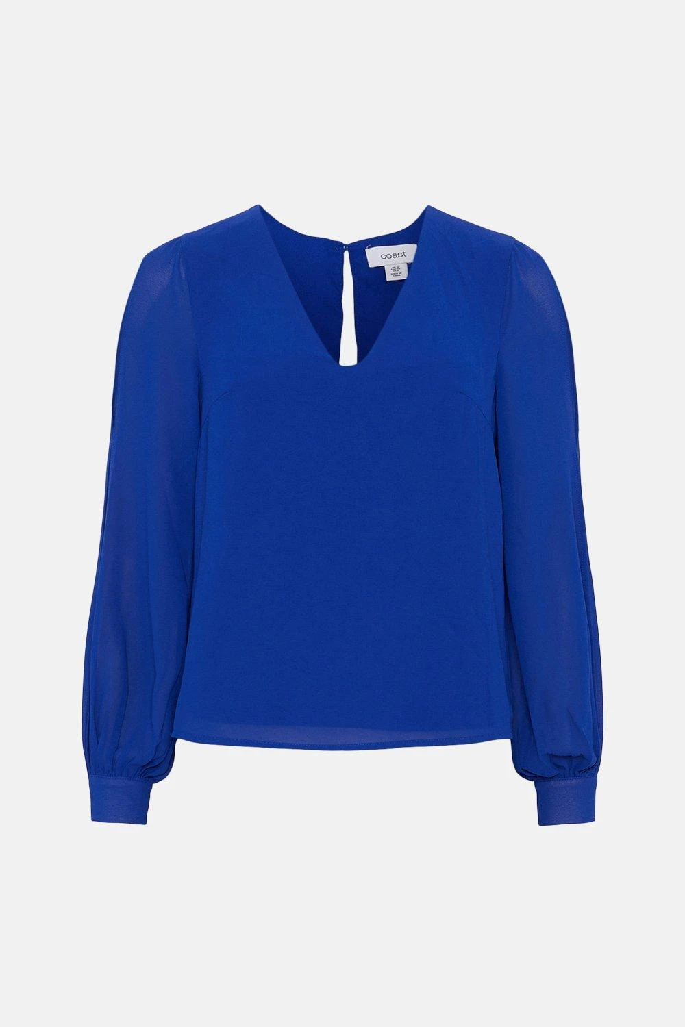 A style staple with a modern twist, this polished blouse highlights the arms with split-detail sleeves and buttoned cuffs. Descending down into a sharp, V-neck bodice that complements the gauzy, semi-sheer sleeves, it makes a confident choice for a day of meetings or a drawn-out dinner with friends.