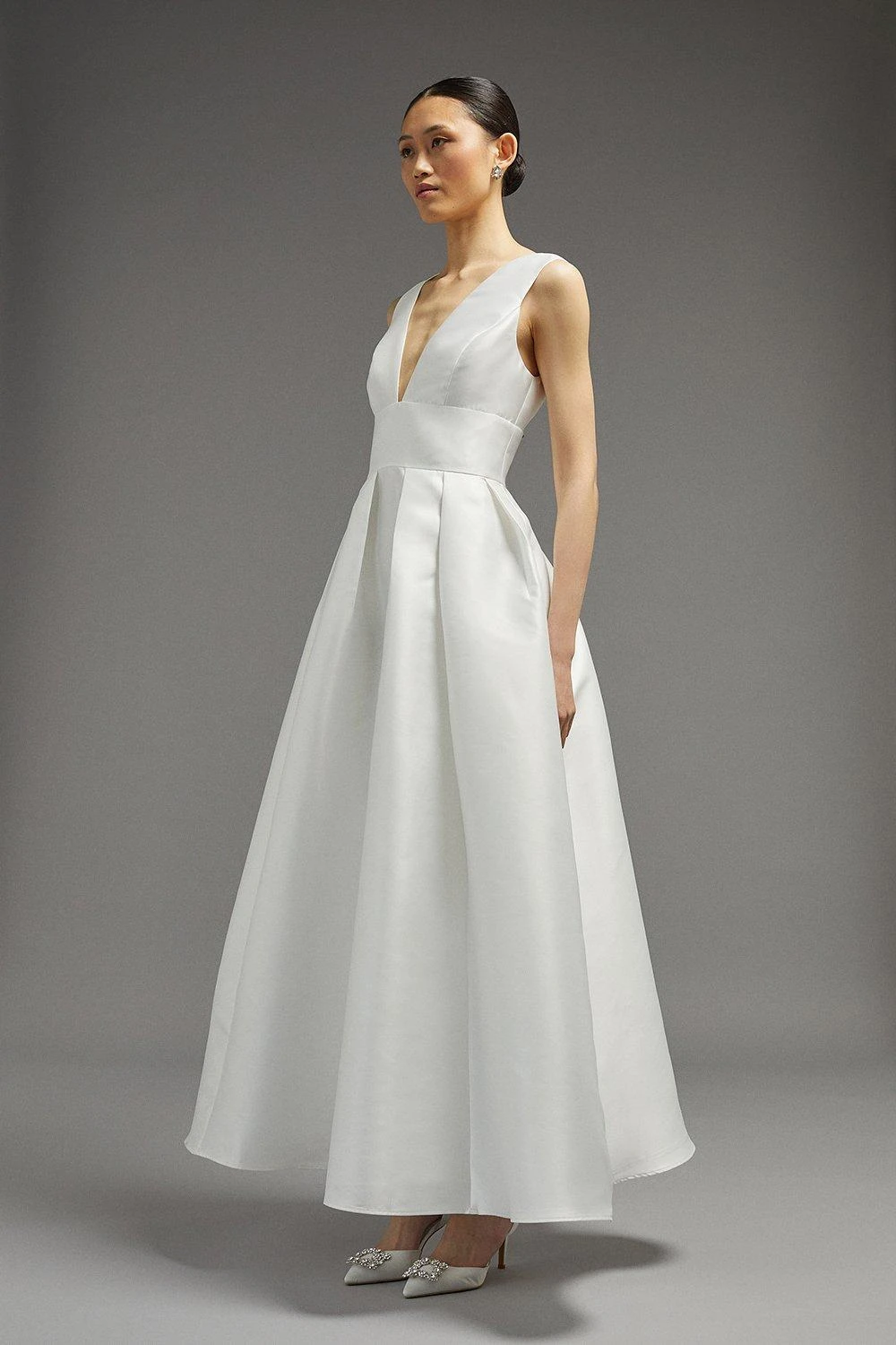 An Audrey Hepburn-inspired design that’s perfect for your big day. This clean-lined satin maxi dress skims the form thanks to its plunging V-neck bodice and wide, full skirt. Simple in its sophistication, it was made for modern minimalists – just add show-stopping heels and a swept-back chignon.