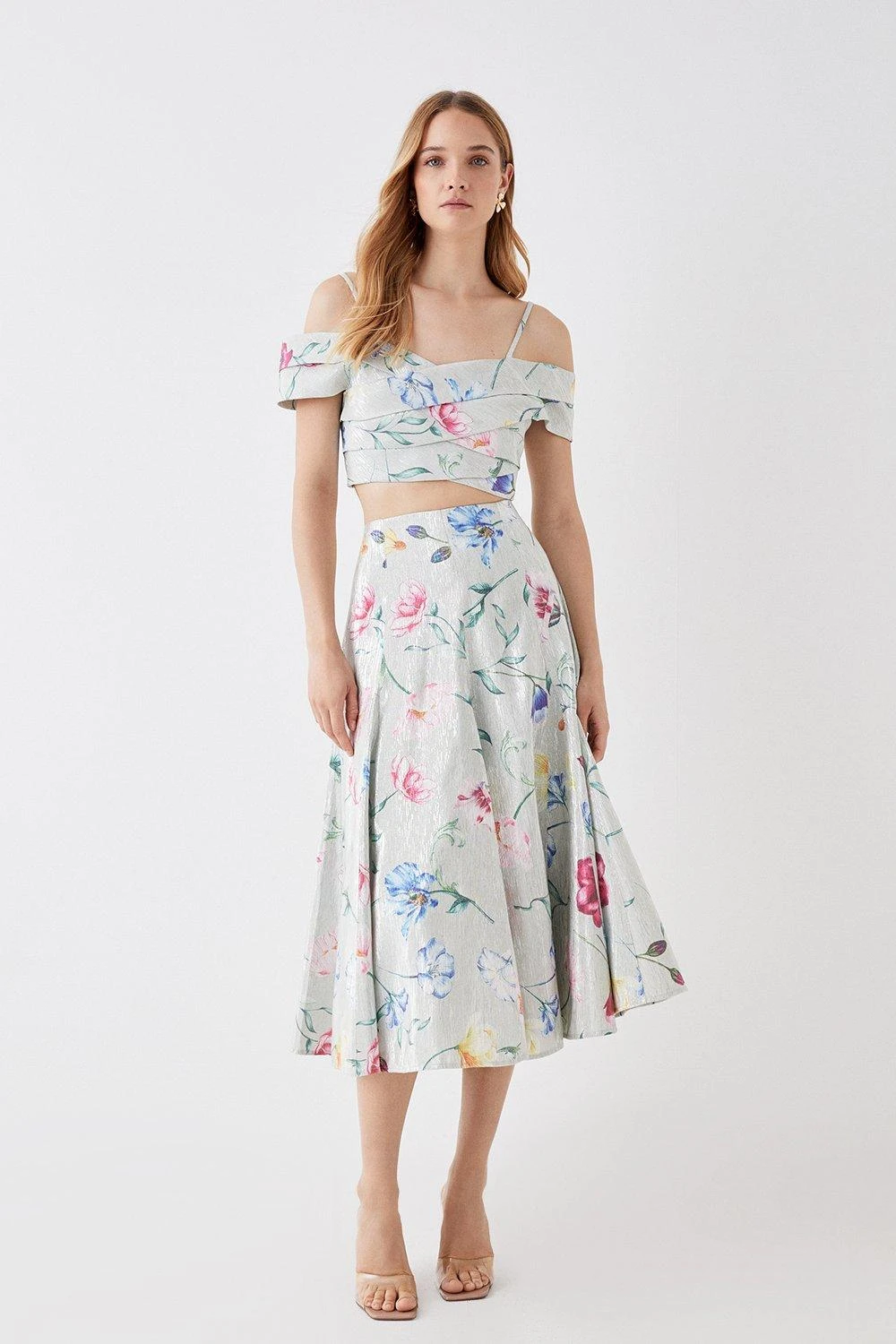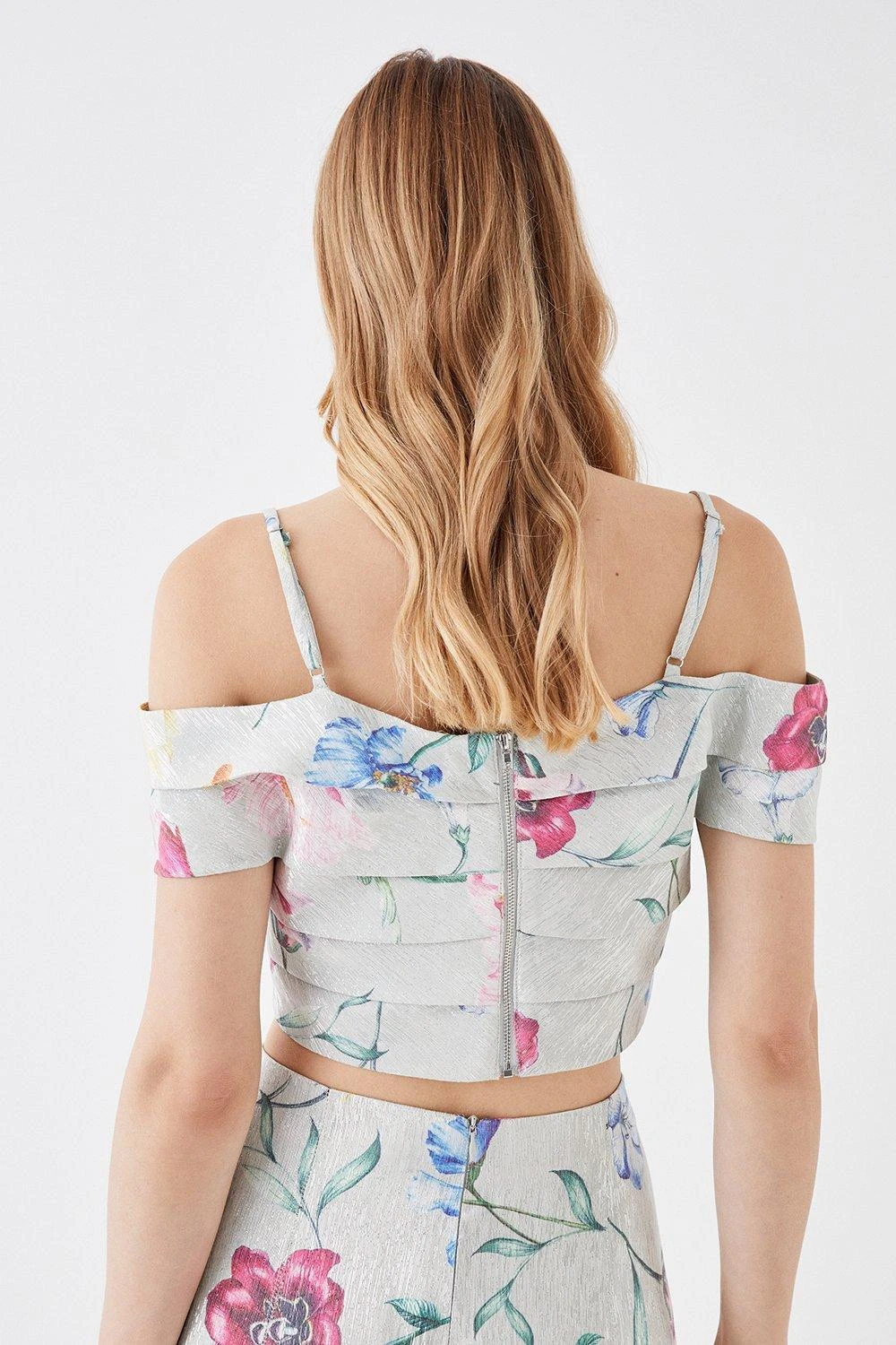 Swathed in exotic blooms, and further elevated by crossover pleats, this crop top exudes modern femininity. Pair it with the matching skirt for a bubbly, yet sophisticated occasion look.