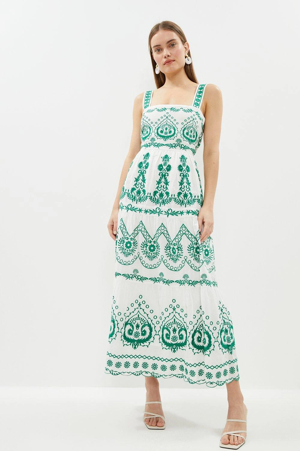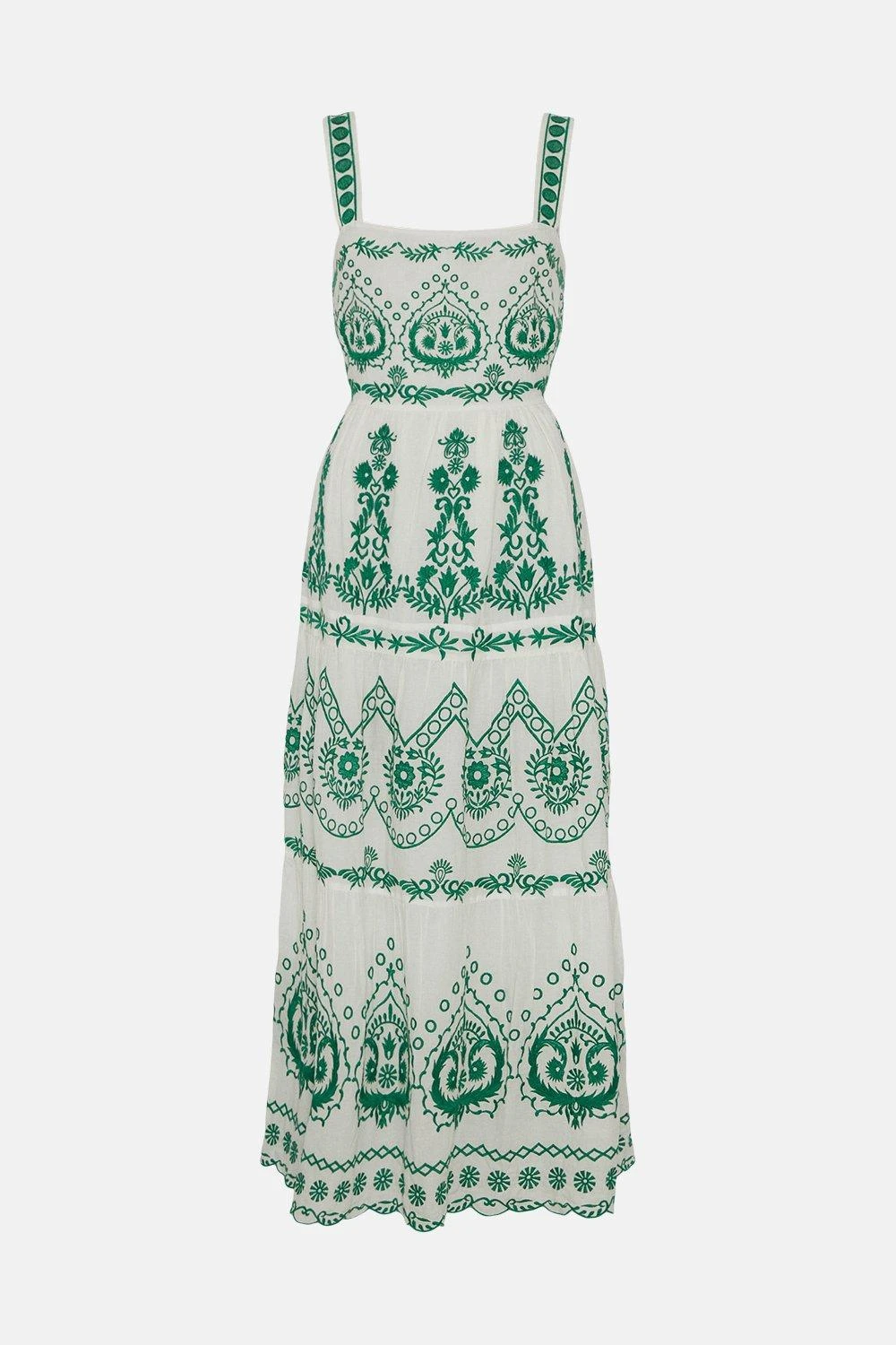 A true bohemian beauty. This tile-print maxi dress showcases artistic craftsmanship and a universally flattering shape. The elegant square neckline offsets a back cut-out detail, drawing attention to the exquisite embroidery throughout.