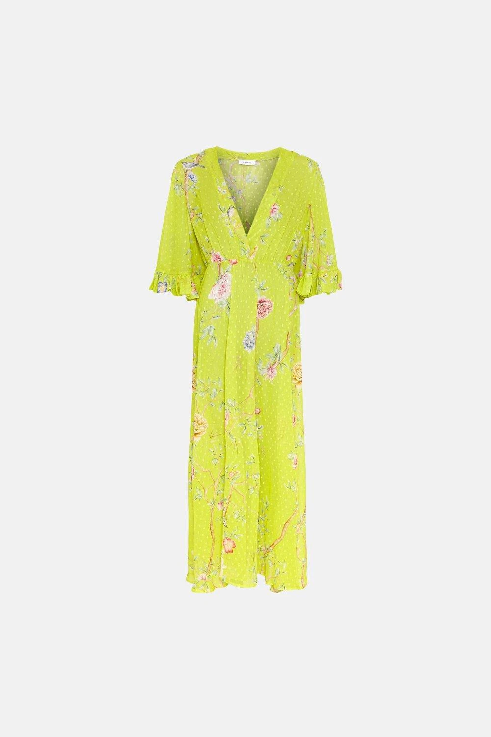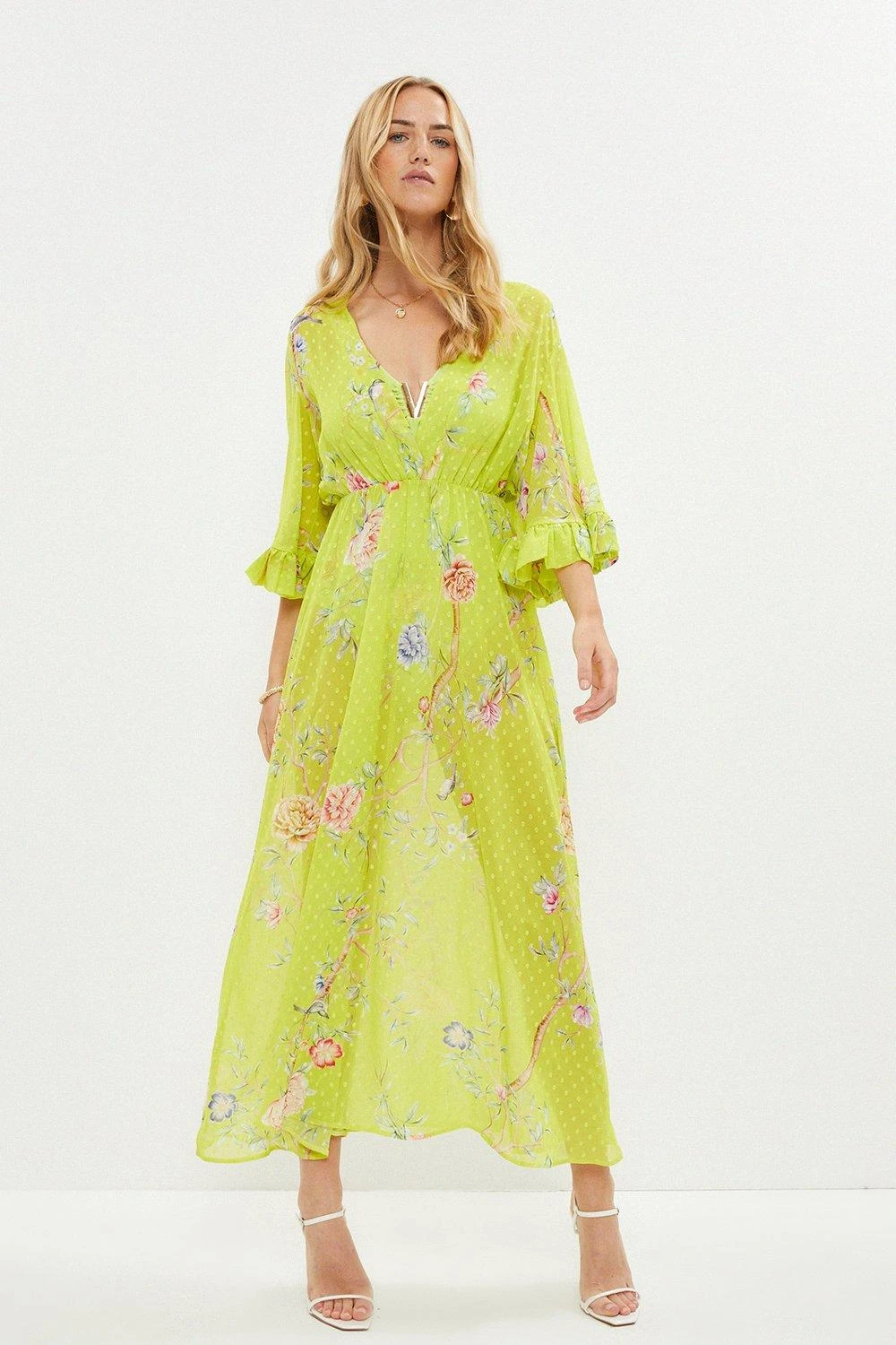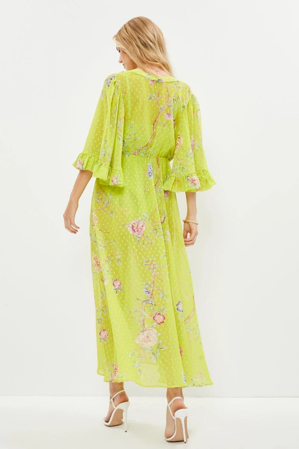Ruffle up a beautiful beachside look with this airy cover-up. Detailed with romantic ruffled sleeves and a gathered waistline, it adds a dash of opulence to your favourite swimwear looks. Accent the V-neckline with delicate gold chains to show off sun-kissed skin whilst relaxing poolside.